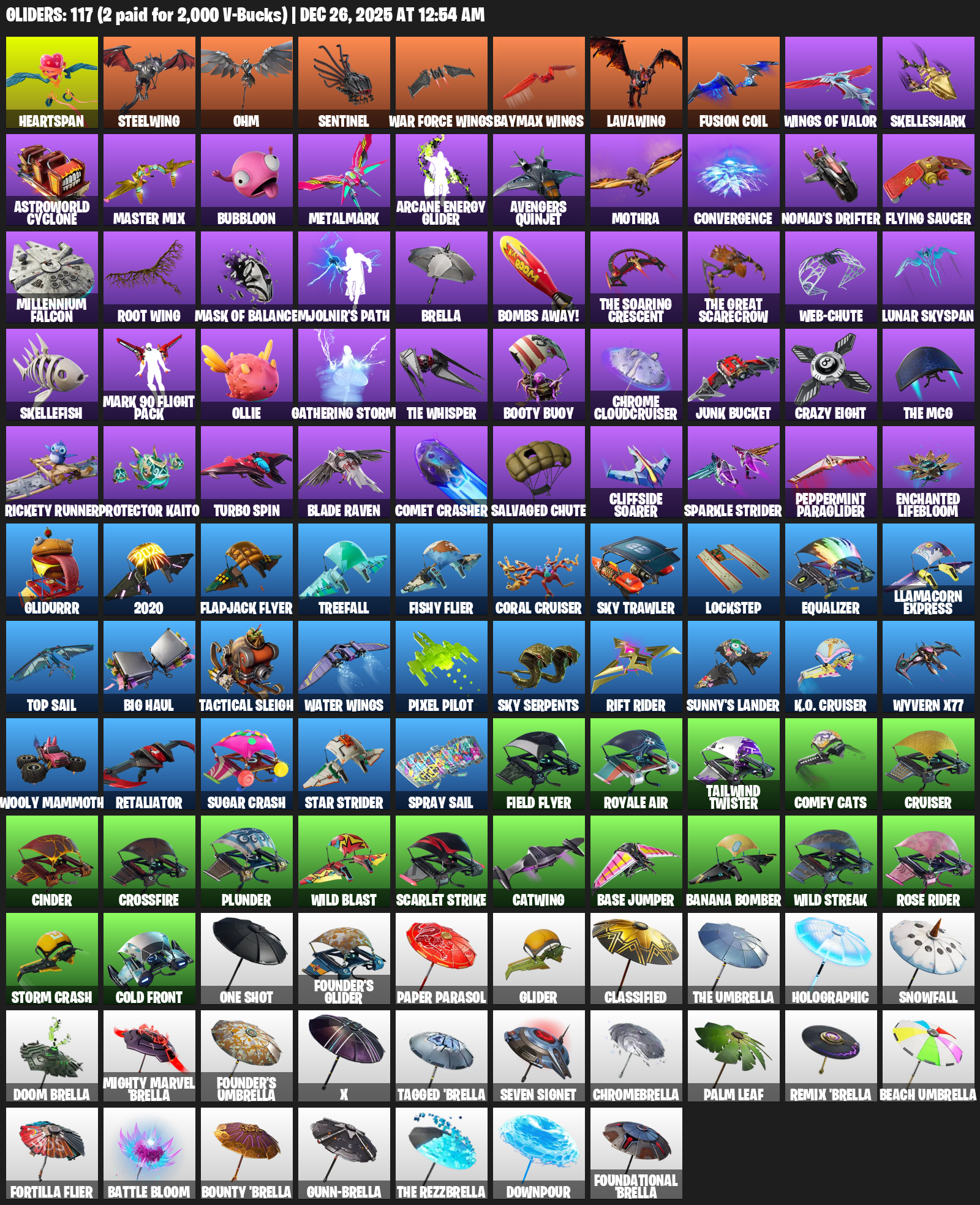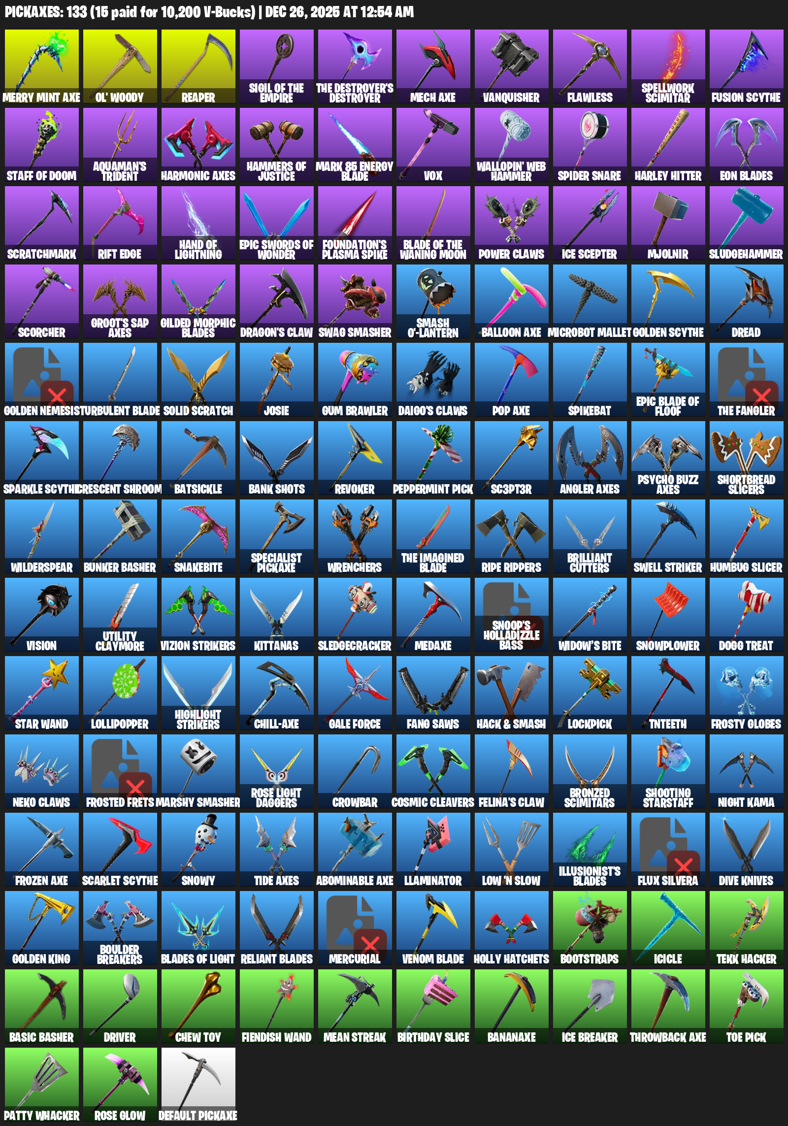 Merry Mint Axe, Ol’ Woody, Reaper, Vanquisher, Flawless, Spellwork Scimitar, Fusion Scythe, Staff of Doom, Aquaman’s Trident, Harmonic Axes, Mark 85 Energy Blade, Vox, Wallopin’ Web Hammer, Spider Snare, Harley Hitter, Eon Blades