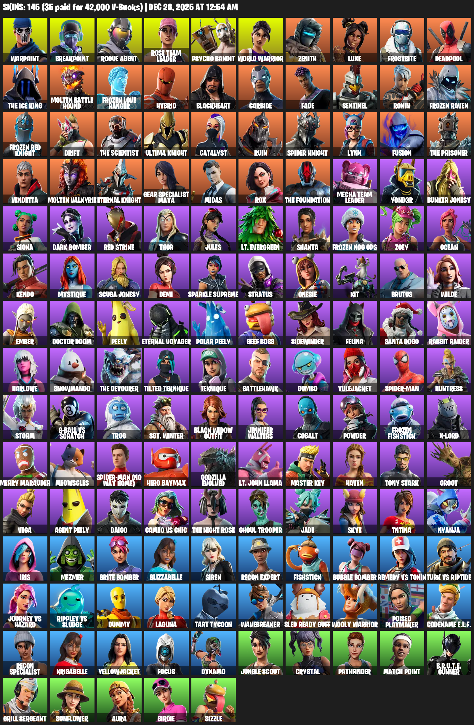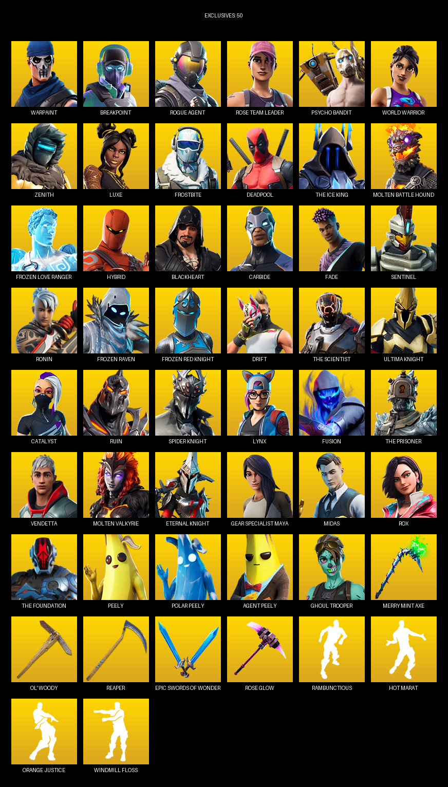 Gear Specialist Maya, Warpaint, Breakpoint, Rogue Agent, Rose Team Leader, Psycho Bandit, World Warrior, Zenith, Luxe, Frostbite, Deadpool, The Ice King, Molten Battle Hound, Frozen Love Ranger, Hybrid, Blackheart, Carbide, Fade, Sentinel, Ronin