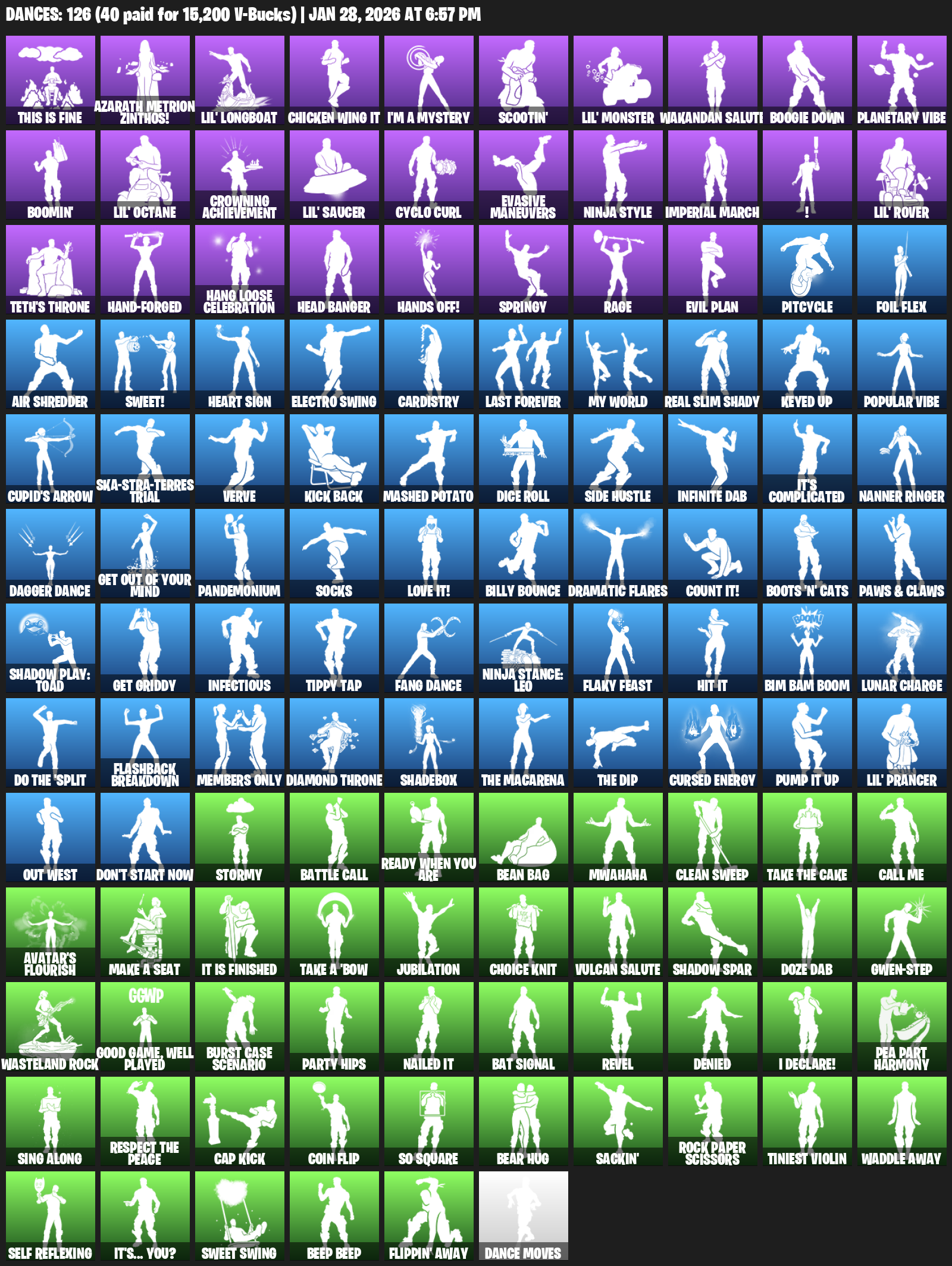 This is Fine, Azarath Metrion Zinthos!, Lil’ Longboat, Chicken Wing It, I’m a Mystery, Scootin’, Wakandan Salute, Boogie Down, Planetary Vibe, Boomin’, Crowning Achievement, Cyclo Curl, Evasive Maneuvers, Ninja Style, Imperial March, !