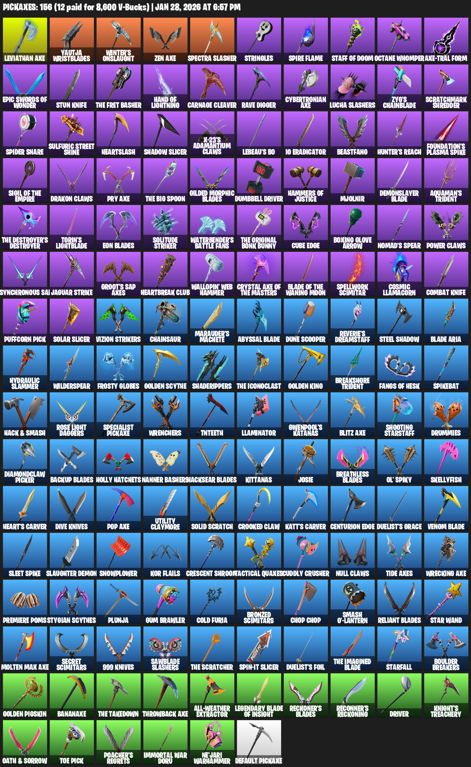 Leviathan Axe, Yautja Wristblades, Winter’s Onslaught, Spectra Slasher, Stringles, Staff of Doom, Octane Whomper, Stun Knife, Carnage Cleaver, Rave Digger, Lucha Slashers, Zyg’s Chainblade, Scratchmark Shredder