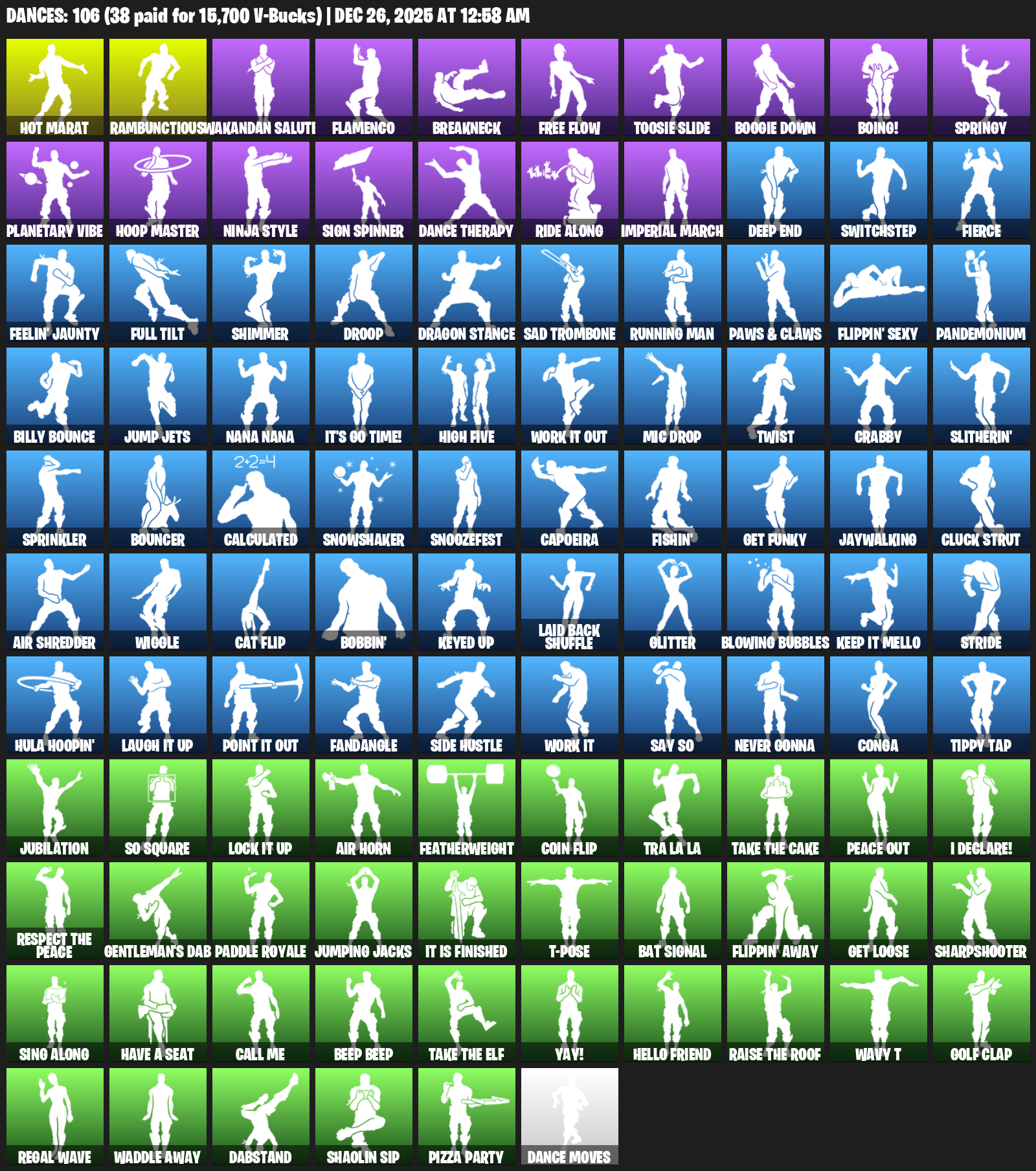 Hot Marat, Rambunctious, Wakandan Salute, Flamenco, Breakneck, Free Flow, Toosie Slide, Boogie Down, Boing!, Springy, Planetary Vibe, Hoop Master, Ninja Style, Sign Spinner, Dance Therapy, Ride Along, Imperial March, Deep End, Switchstep, Fierce