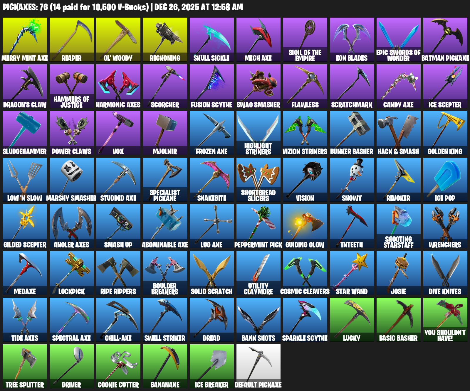 Merry Mint Axe, Reaper, Ol’ Woody, Reckoning, Skull Sickle, Eon Blades, Batman Pickaxe, Dragon’s Claw, Hammers of Justice, Harmonic Axes, Scorcher, Swag Smasher, Flawless, Scratchmark