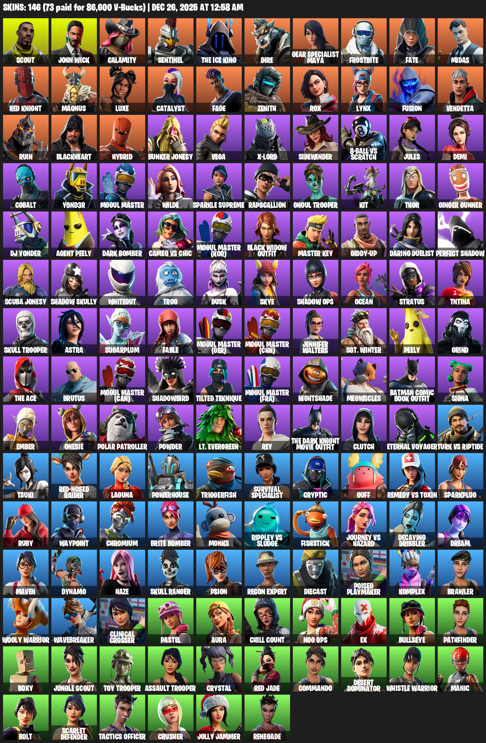 [PC/PSN/XBOX] | 146 skins | Merry Mint Axe | Scout | John Wick | Calamity | Sentinel | The Ice King | Dire | Gear Specialist Maya | #QSB8302