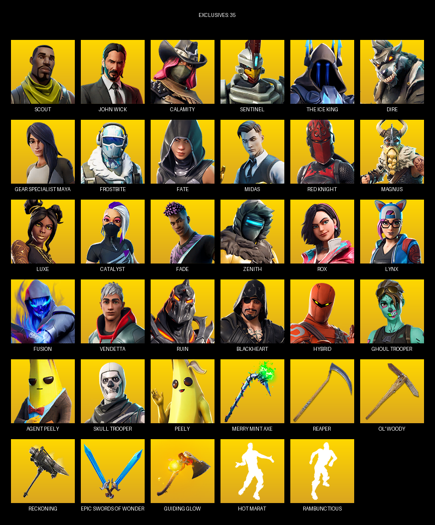 Gear Specialist Maya, Scout, John Wick, Calamity, Sentinel, The Ice King, Dire, Frostbite, Fate, Midas, Red Knight, Magnus, Luxe, Catalyst, Fade, Zenith, Rox, Lynx, Fusion, Vendetta