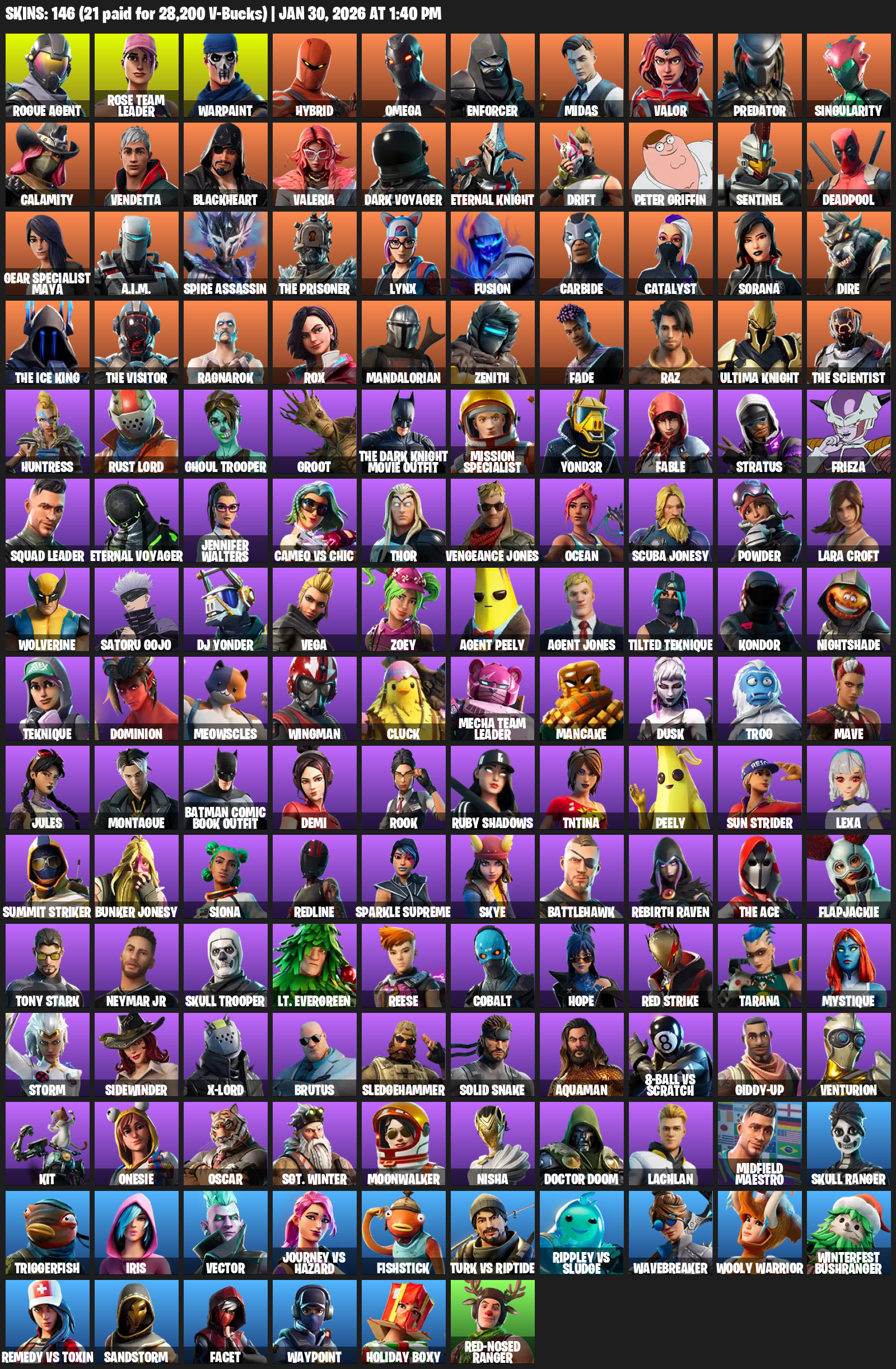 [PC/PSN/XBOX] | 146 skins | Take The L | OG STW | Omega | Lara Croft | Rogue Agent | Rose Team Leader | Warpaint | Hybrid | Enforcer | #OQV9024