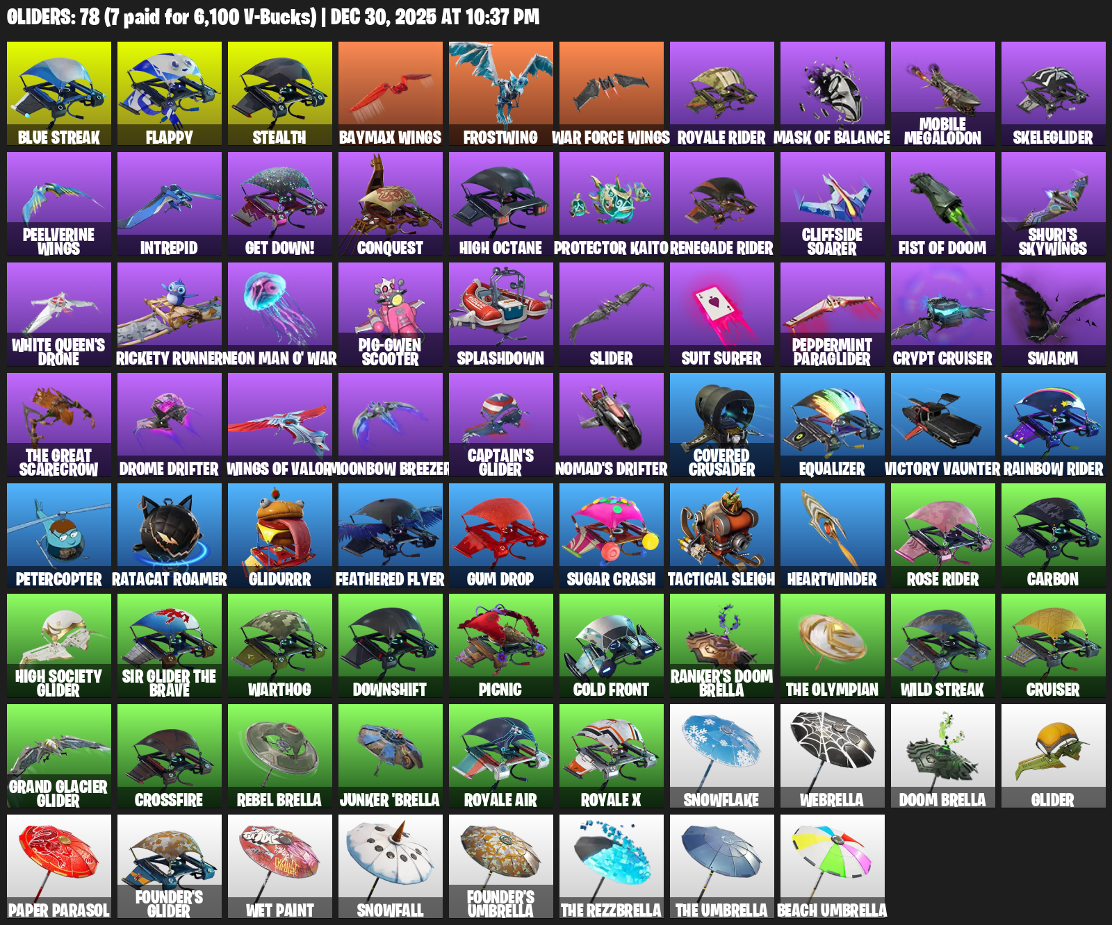 Flappy, Stealth, Baymax Wings, Frostwing, Mask of Balance, Mobile Megalodon, Skeleglider, Intrepid, Get Down!, Conquest, High Octane, Protector Kaito, Cliffside Soarer, Shuri’s Skywings