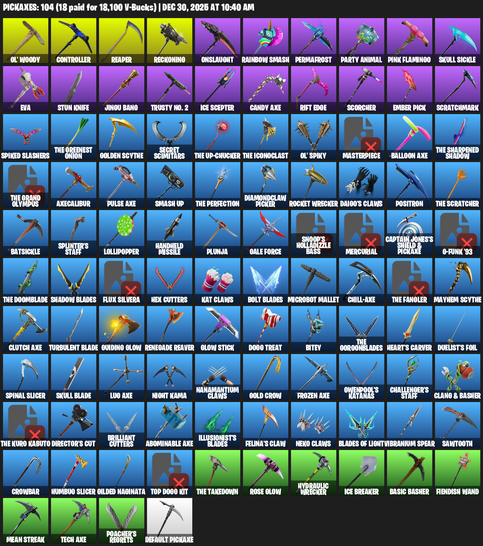 Ol’ Woody, Controller, Reckoning, Onslaught, Rainbow Smash, Permafrost, Party Animal, Pink Flamingo, Skull Sickle, EVA, Stun Knife, Jingu Bang, Trusty No. 2, Ice Scepter, Candy Axe, Rift Edge, Scorcher, Ember Pick, Scratchmark