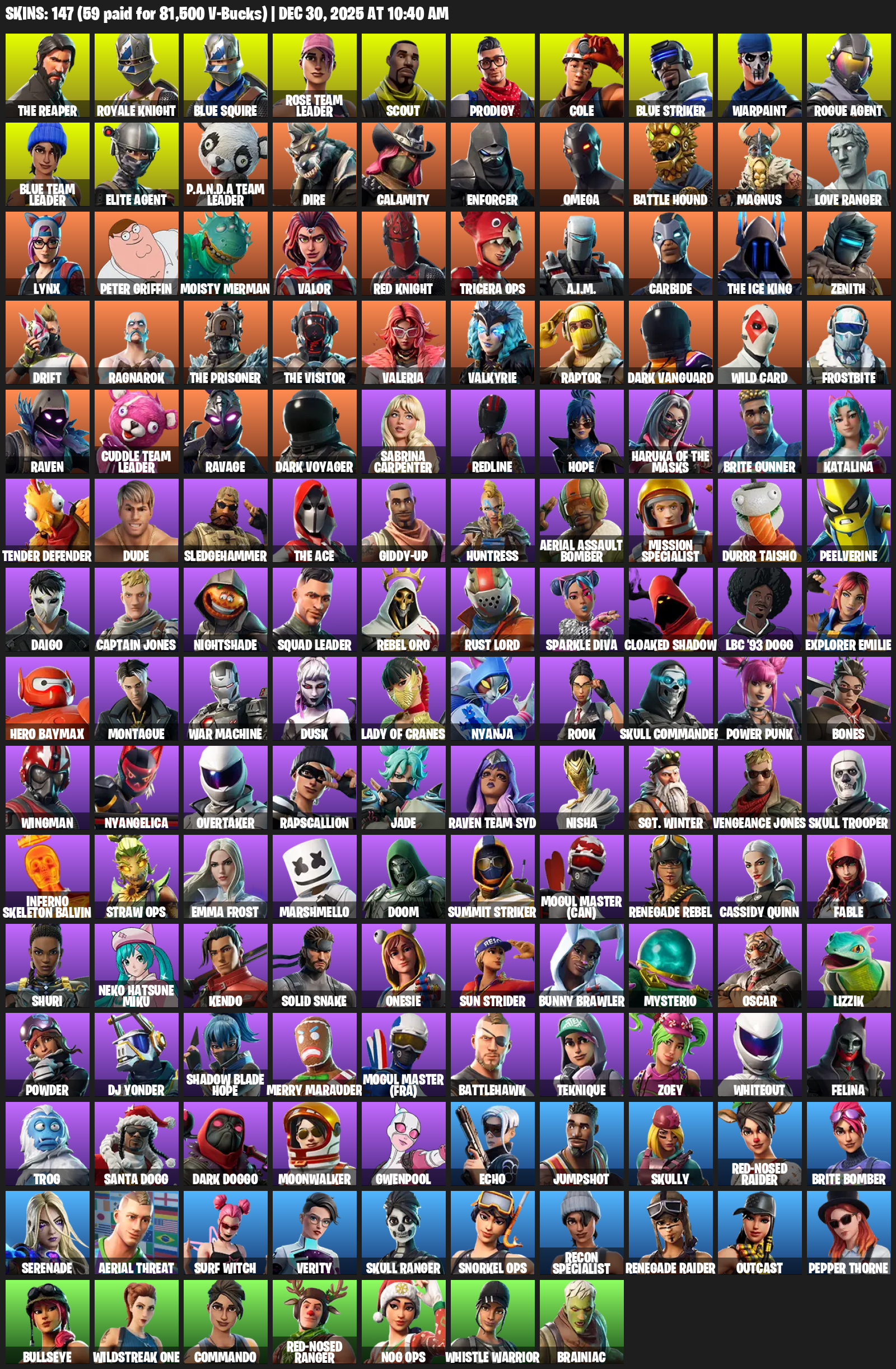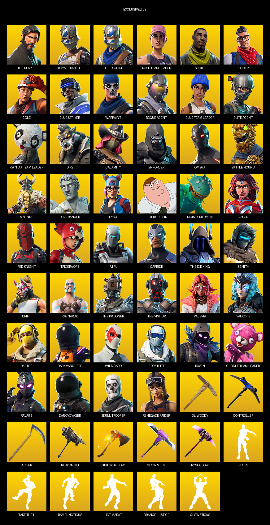 The Reaper, Royale Knight, Blue Squire, Elite Agent, Omega, Renegade Raider, Rose Team Leader, Scout, Prodigy, Cole, Warpaint, Dire, Calamity, Enforcer, Battle Hound, Magnus