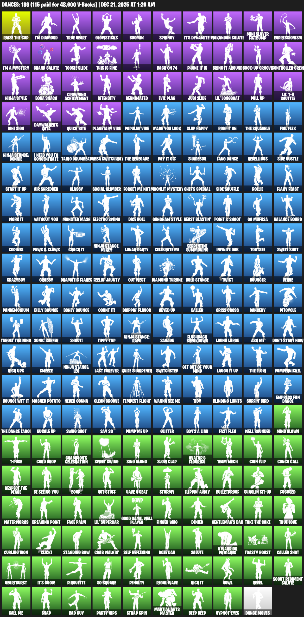 I’m Diamond, True Heart, Glowsticks, Boomin’, Springy, It’s Dynamite!, Wakandan Salute, Mini Slayer Fistbump, Expressionism, Toosie Slide, This is Fine, !, Back On 74, Phone It In, Boo’d Up Groove, Controller Crew