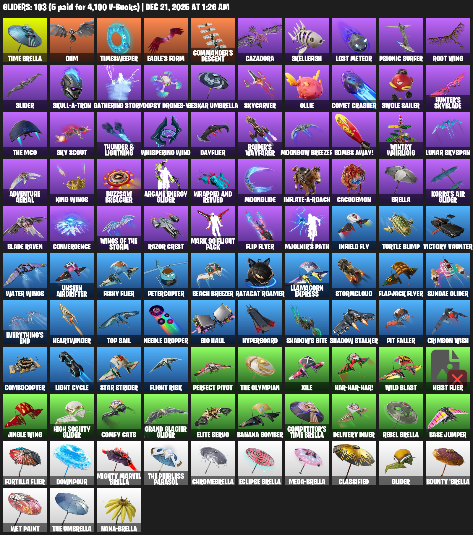 Time Brella, Ohm, Timesweeper, Eagle’s Form, Commander’s Descent, Cazadora, Skellefish, Lost Meteor, Psionic Surfer, Root Wing, Slider, Skull-a-tron, Gathering Storm, Oopsy Drones-y, Beskar Umbrella, Skycarver, Ollie, Comet Crasher, Swole Sailer