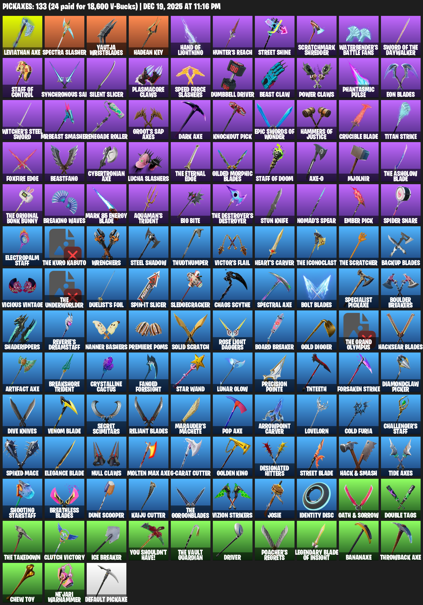 Leviathan Axe, Yautja Wristblades, Hadean Key, Hand of Lightning, Hunter’s Reach, Street Shine, Scratchmark Shredder, Waterbender’s Battle Fans, Synchronous Sai, Silent Slicer, Plasmacore Claws, Speed Force Slashers, Dumbbell Driver, Beast Claw, Phantasmic Pulse, Eon Blades