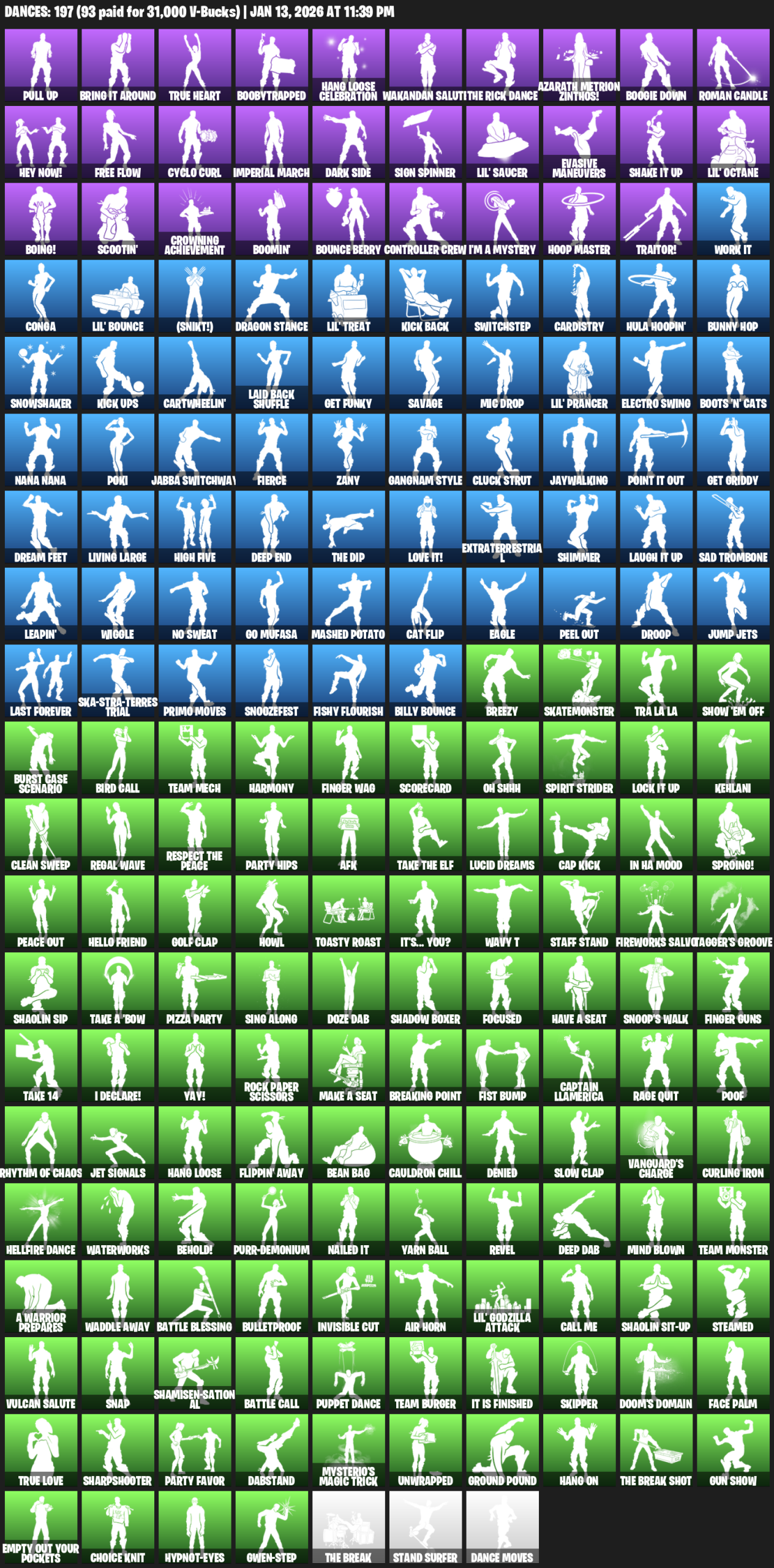 Pull Up, Bring it around, True Heart, Boobytrapped, Hang Loose Celebration, Wakandan Salute, Azarath Metrion Zinthos!, Boogie Down, Roman Candle, Hey Now!, Free Flow, Cyclo Curl, Imperial March, Dark Side, Sign Spinner, Lil’ Saucer, Evasive Maneuvers