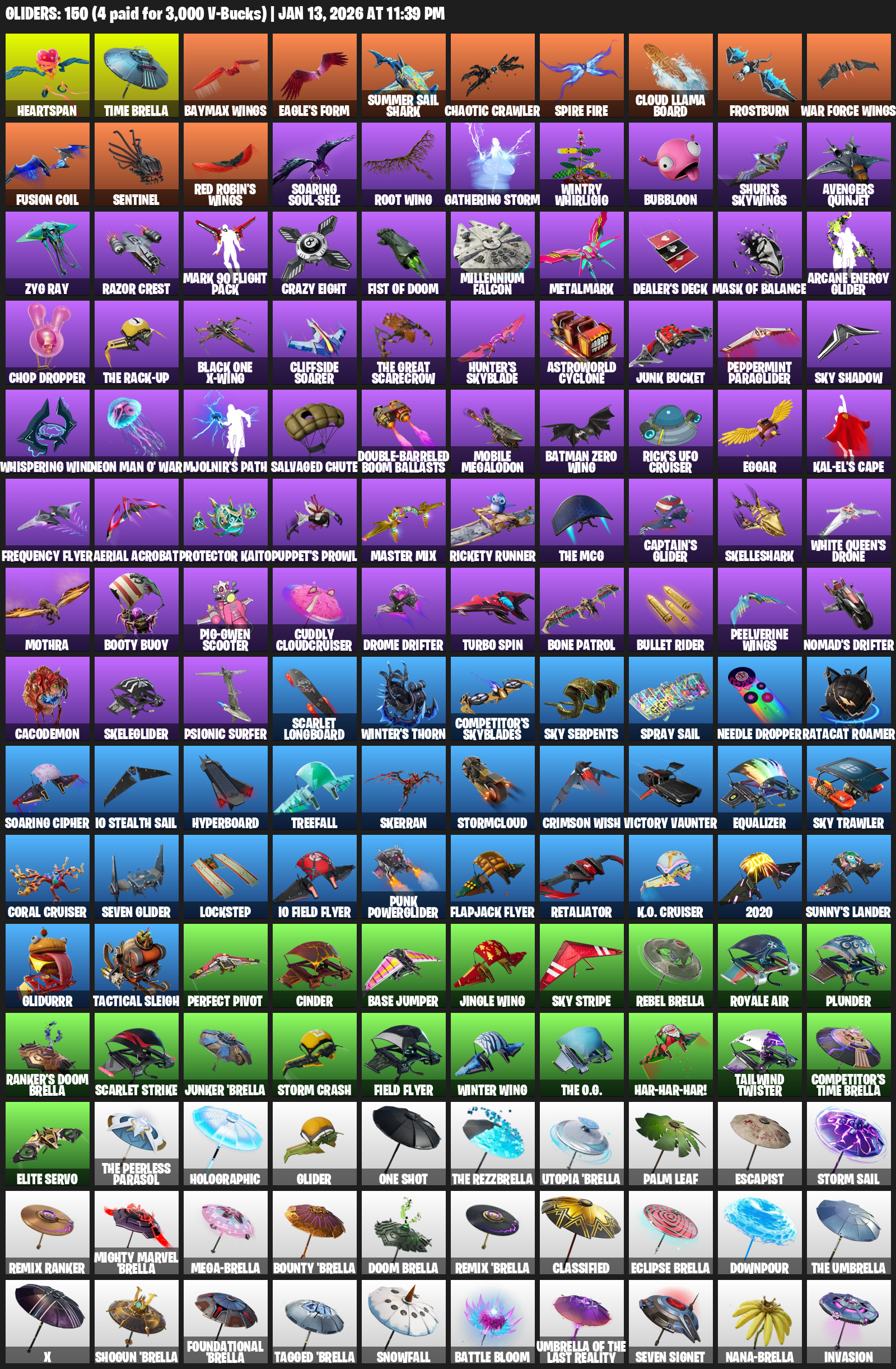 Heartspan, Time Brella, Baymax Wings, Eagle’s Form, Summer Sail Shark, Chaotic Crawler, Cloud Llama Board, Frostburn, Soaring Soul-Self, Root Wing, Gathering Storm, Wintry Whirligig, Bubbloon, Shuri’s Skywings, Avengers Quinjet