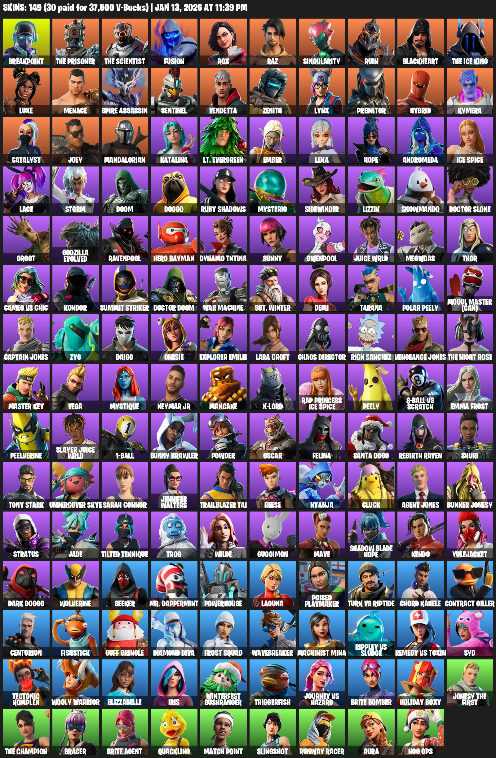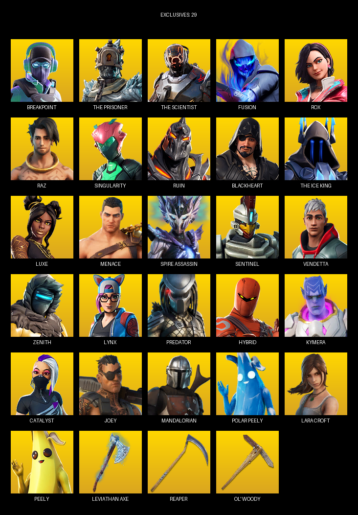 Lara Croft, Breakpoint, The Prisoner, Fusion, Rox, Raz, Singularity, Ruin, Blackheart, Luxe, Menace, Spire Assassin, Sentinel, Vendetta, Zenith, Lynx, Predator, Hybrid