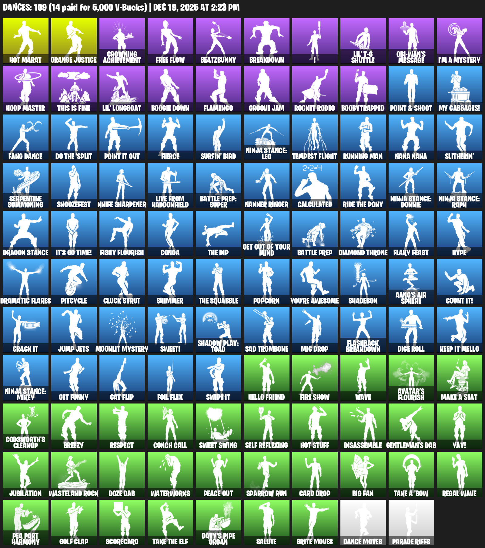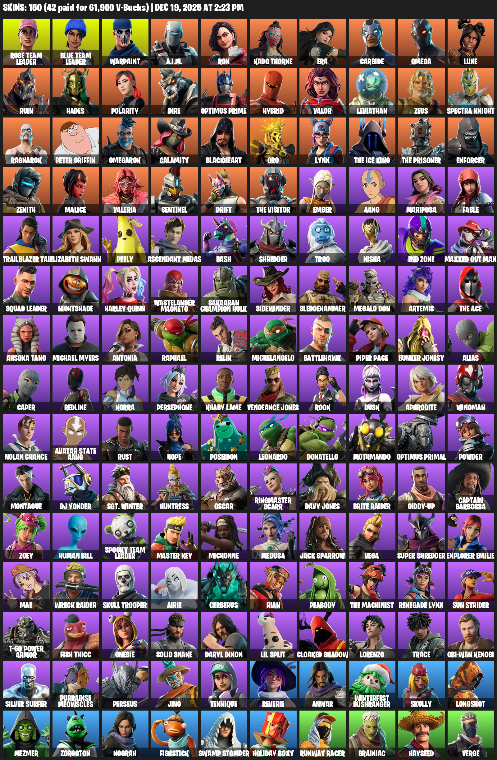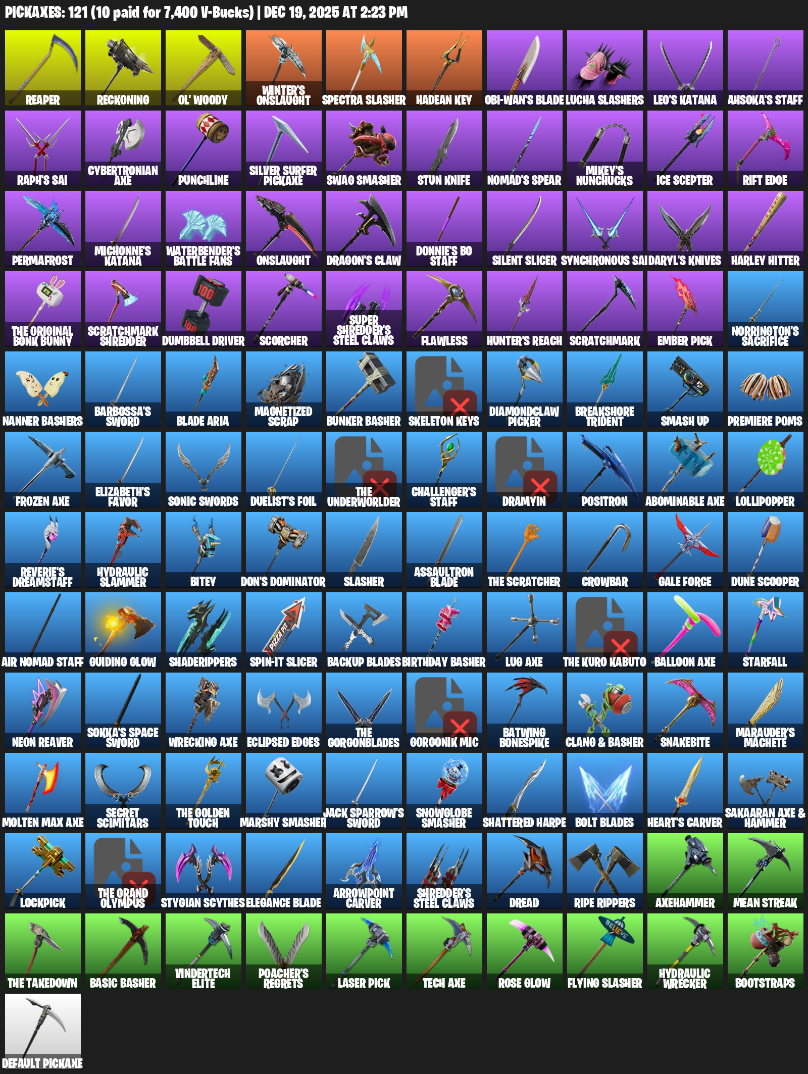Reaper, Reckoning, Ol’ Woody, Winter’s Onslaught, Hadean Key, Obi-Wan’s Blade, Lucha Slashers, Leo’s Katana, Ahsoka’s Staff, Raph’s Sai, Cybertronian Axe, Punchline, Silver Surfer Pickaxe, Swag Smasher, Stun Knife, Nomad’s Spear, Mikey’s Nunchucks, Ice Scepter, Rift Edge