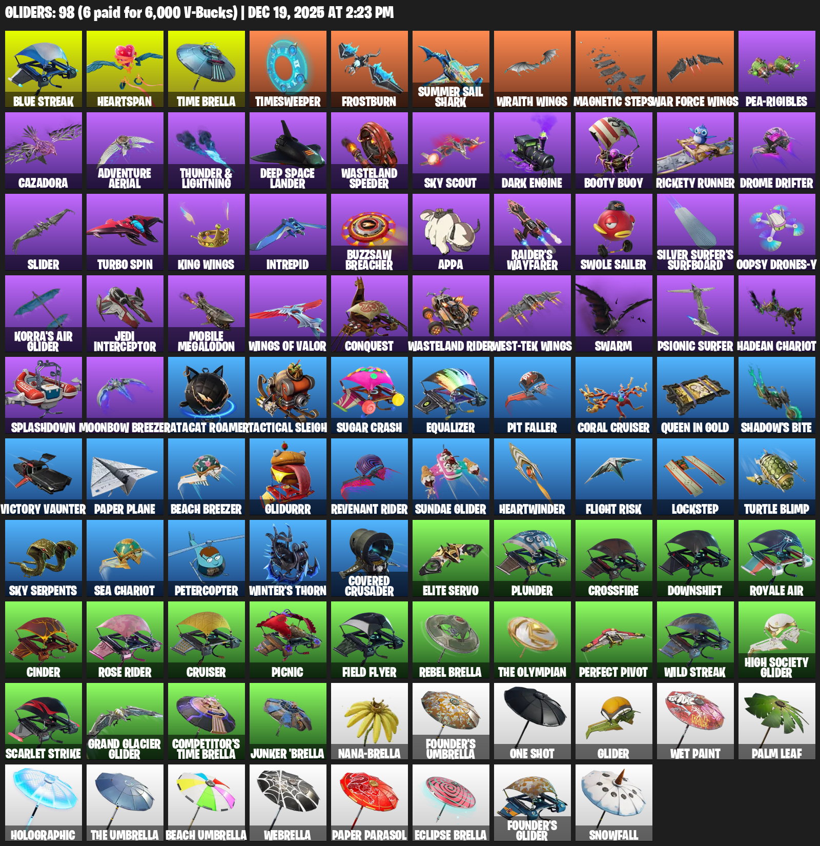 Blue Streak, Heartspan, Time Brella, Timesweeper, Frostburn, Summer Sail Shark, Wraith Wings, Magnetic Steps, Pea-rigibles, Cazadora, Adventure Aerial, Deep Space Lander, Wasteland Speeder, Sky Scout, Dark Engine, Booty Buoy, Rickety Runner, Drome Drifter