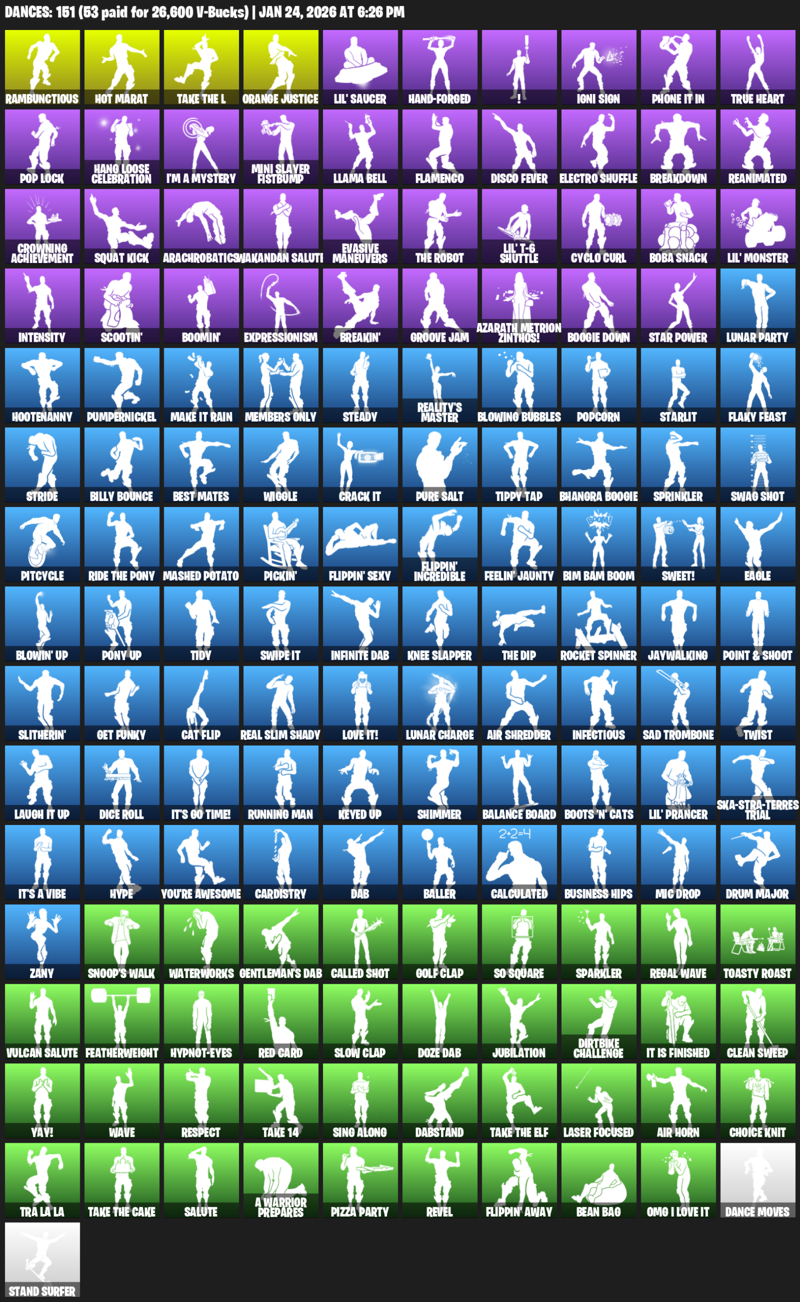 Hot Marat, Rambunctious, Orange Justice, Lil’ Saucer, Hand-Forged, !, Igni Sign, Phone It In, True Heart, Pop Lock, Hang Loose Celebration, I’m a Mystery, Mini Slayer Fistbump, Llama Bell, Flamenco, Disco Fever, Electro Shuffle, Breakdown, Reanimated