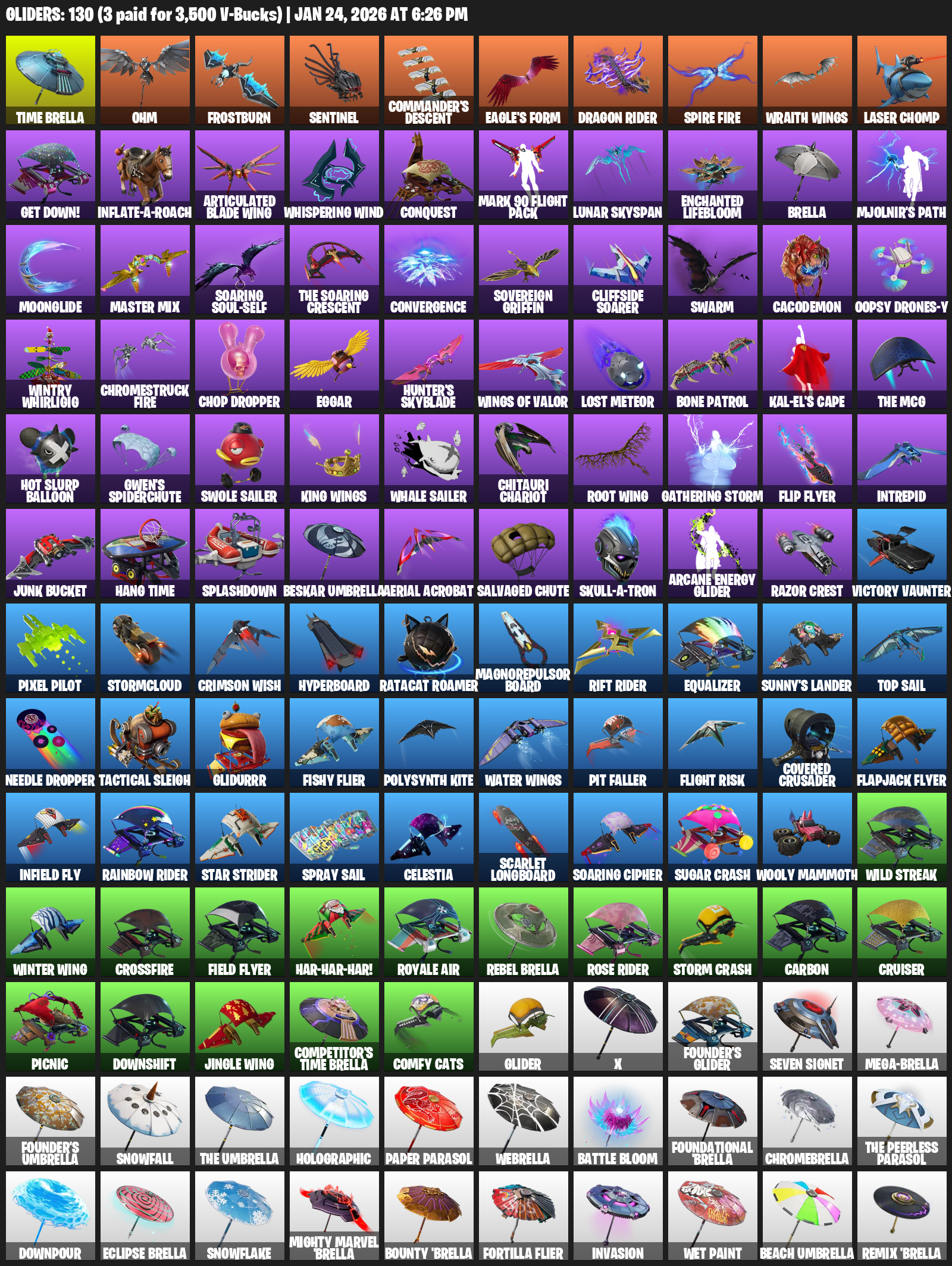 Time Brella, Ohm, Frostburn, Sentinel, Commander’s Descent, Eagle’s Form, Spire Fire, Wraith Wings, Laser Chomp, Get Down!, Whispering Wind, Conquest, Mark 90 Flight Pack, Lunar Skyspan, Enchanted Lifebloom, Mjolnir’s Path