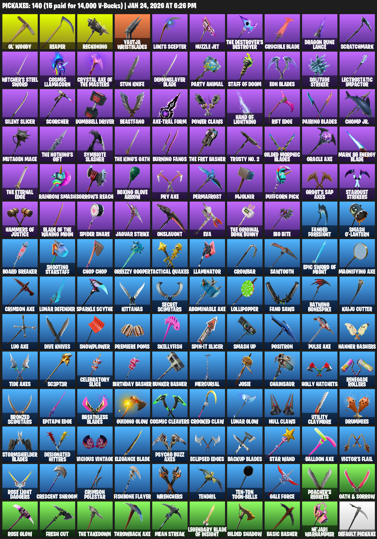 Ol’ Woody, Reckoning, Yautja Wristblades, Loki’s Scepter, Nuzzle Jet, Crucible Blade, Dragon Rune Lance, Scratchmark, Witcher’s Steel Sword, Cosmic Llamacorn, Stun Knife, Party Animal, Staff of Doom, Eon Blades, Solitude Striker, Lectrostatic Impactor