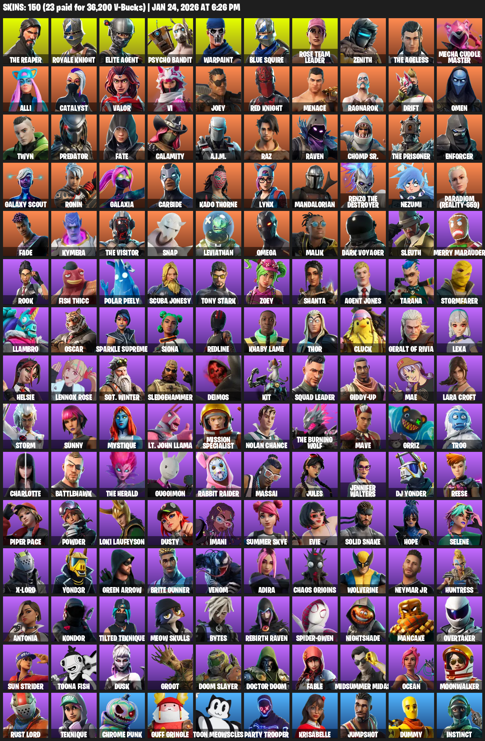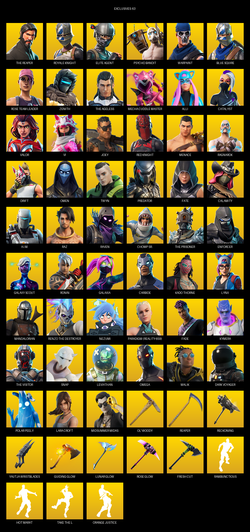 The Reaper, Royale Knight, Elite Agent, Blue Squire, Omega, Lara Croft, Psycho Bandit, Warpaint, Rose Team Leader, Zenith, Mecha Cuddle Master, Alli, Catalyst, Valor, Vi, Joey, Menace, Ragnarok