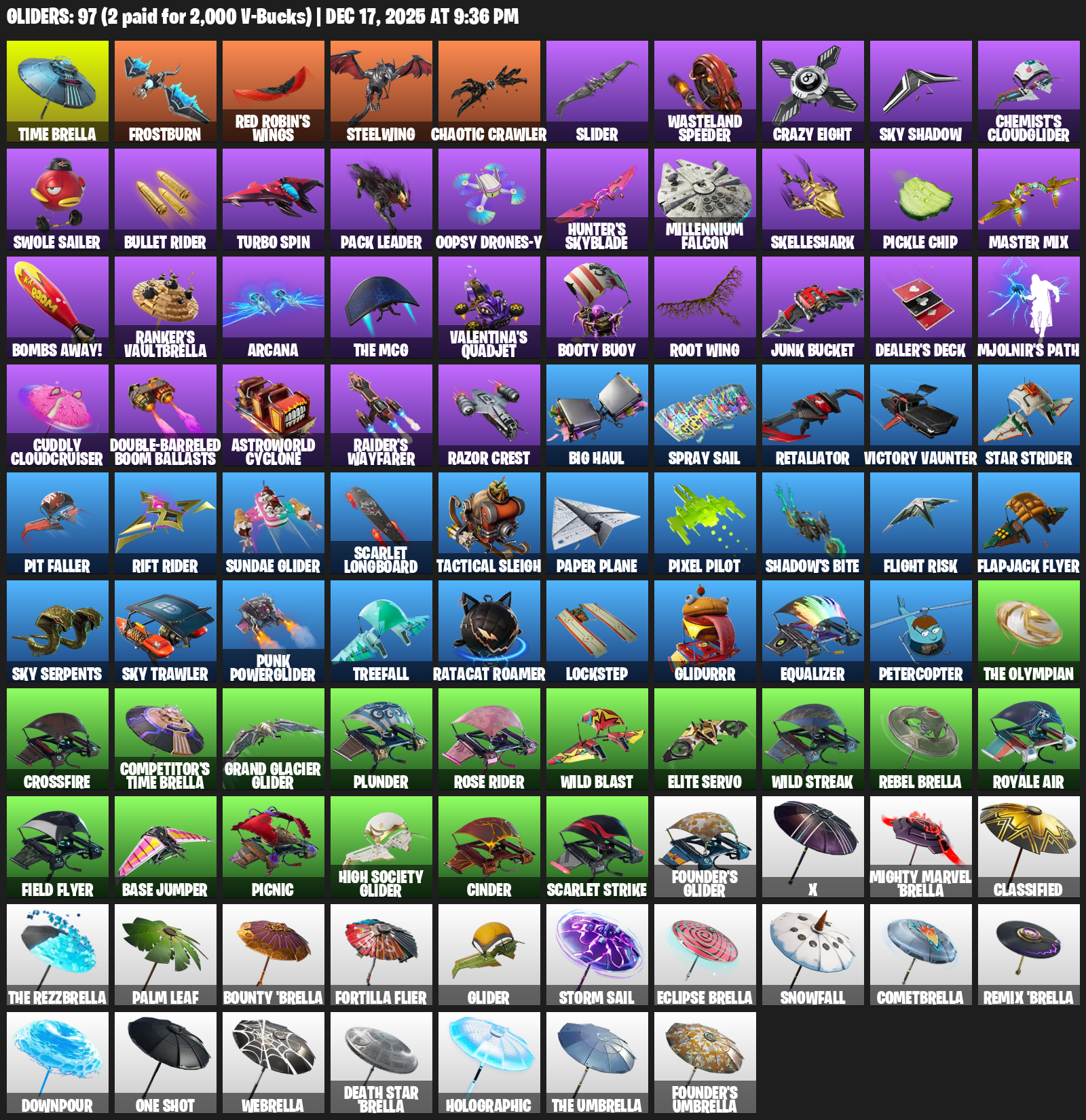 Time Brella, Frostburn, Red Robin’s Wings, Steelwing, Chaotic Crawler, Slider, Wasteland Speeder, Crazy Eight, Sky Shadow, Chemist’s Cloudglider, Swole Sailer, Bullet Rider, Turbo Spin, Oopsy Drones-y, Hunter’s Skyblade, Millennium Falcon, Skelleshark, Pickle Chip