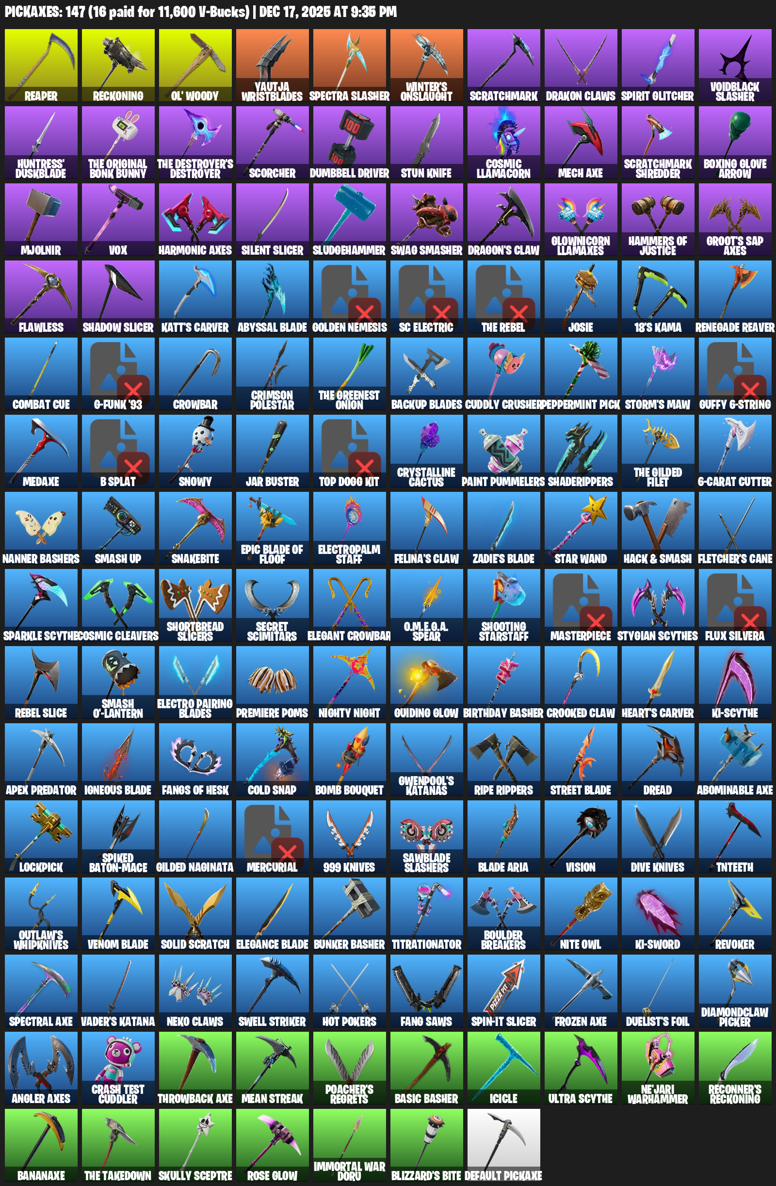 Reaper, Reckoning, Ol’ Woody, Yautja Wristblades, Winter’s Onslaught, Scratchmark, Drakon Claws, Spirit Glitcher, Voidblack Slasher, Huntress’ Duskblade, The Original Bonk Bunny, Scorcher, Dumbbell Driver, Stun Knife, Cosmic Llamacorn, Mech Axe, Boxing Glove Arrow