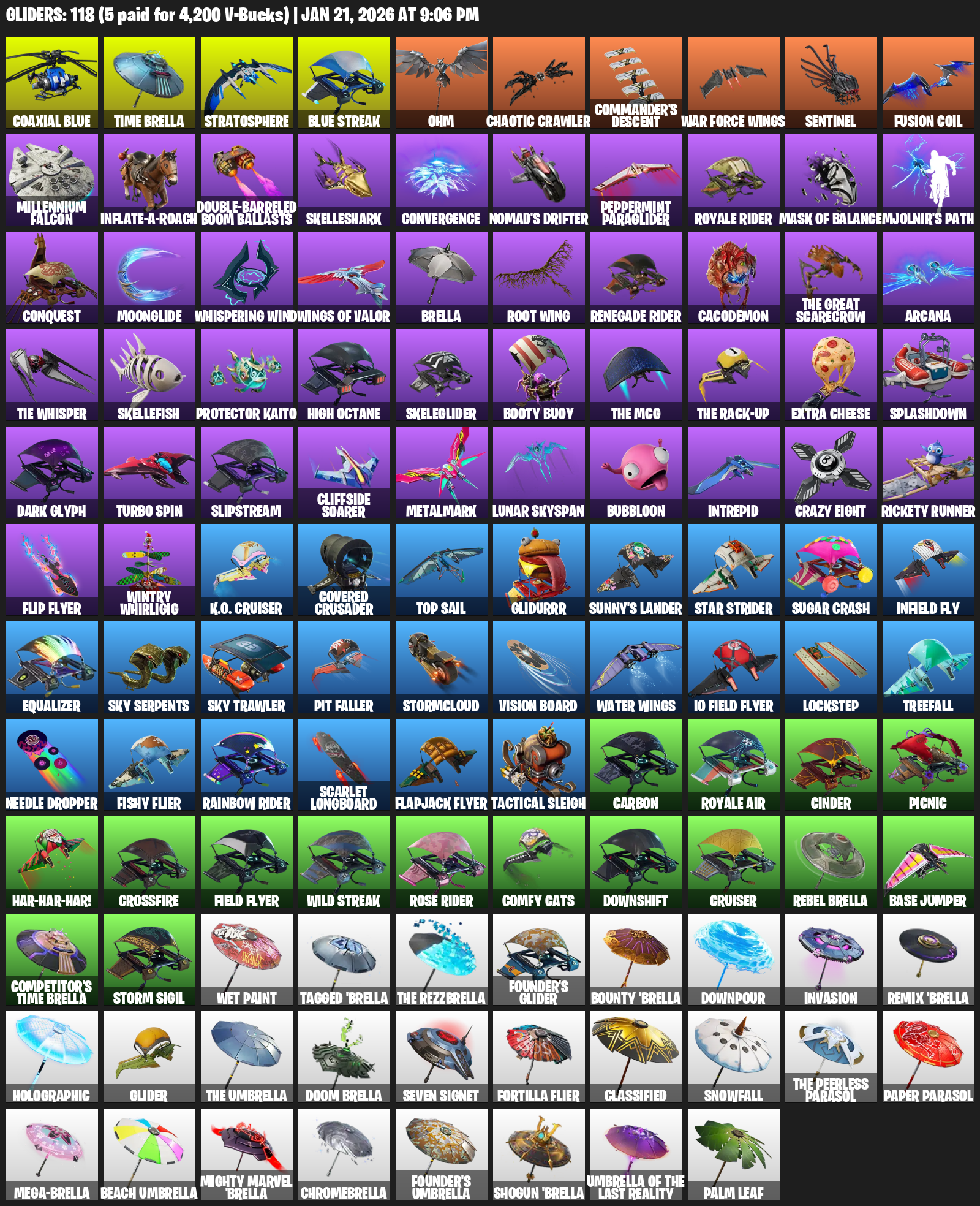 Time Brella, Stratosphere, Ohm, Chaotic Crawler, Commander’s Descent, War Force Wings, Sentinel, Millennium Falcon, Inflate-A-Roach, Double-Barreled Boom Ballasts, Skelleshark, Convergence, Nomad’s Drifter, Peppermint Paraglider, Royale Rider, Mjolnir’s Path