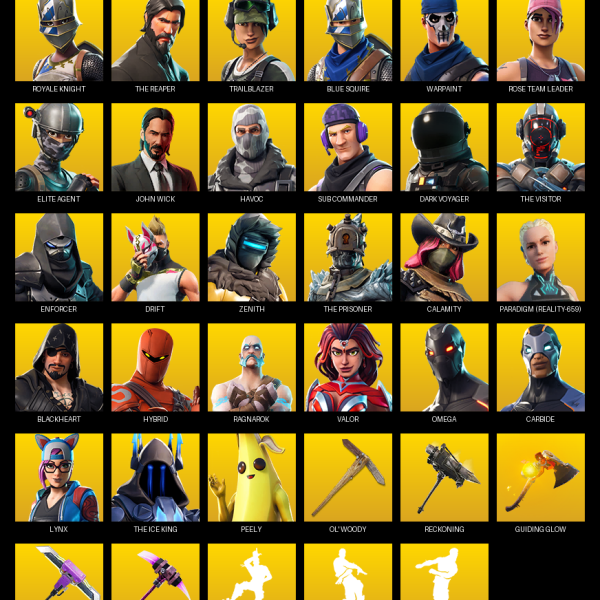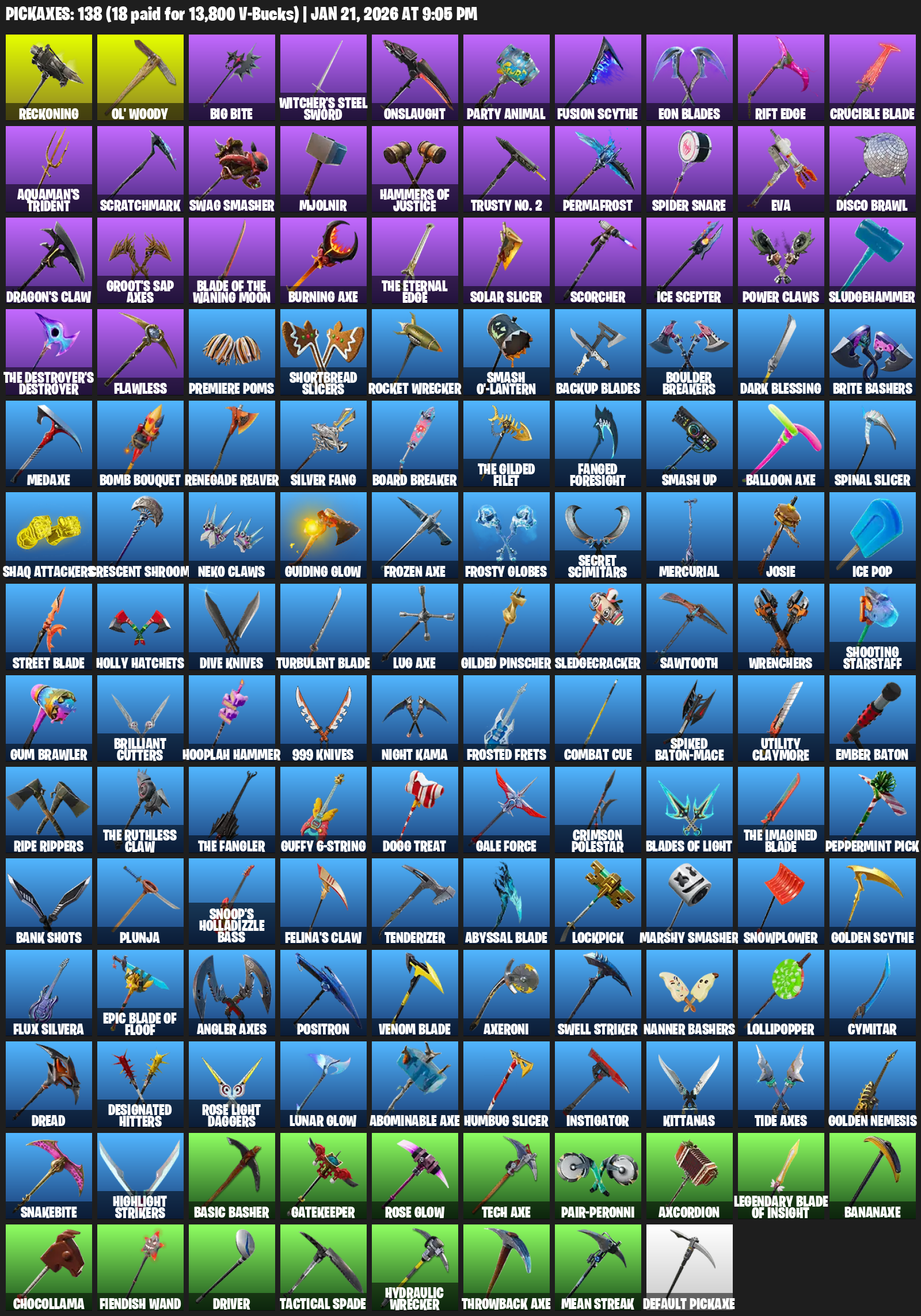 Reckoning, Ol’ Woody, Big Bite, Witcher’s Steel Sword, Onslaught, Party Animal, Fusion Scythe, Eon Blades, Rift Edge, Crucible Blade, Aquaman’s Trident, Scratchmark, Swag Smasher, Mjolnir, Hammers of Justice, Trusty No. 2, Permafrost, Spider Snare, EVA, Disco Brawl
