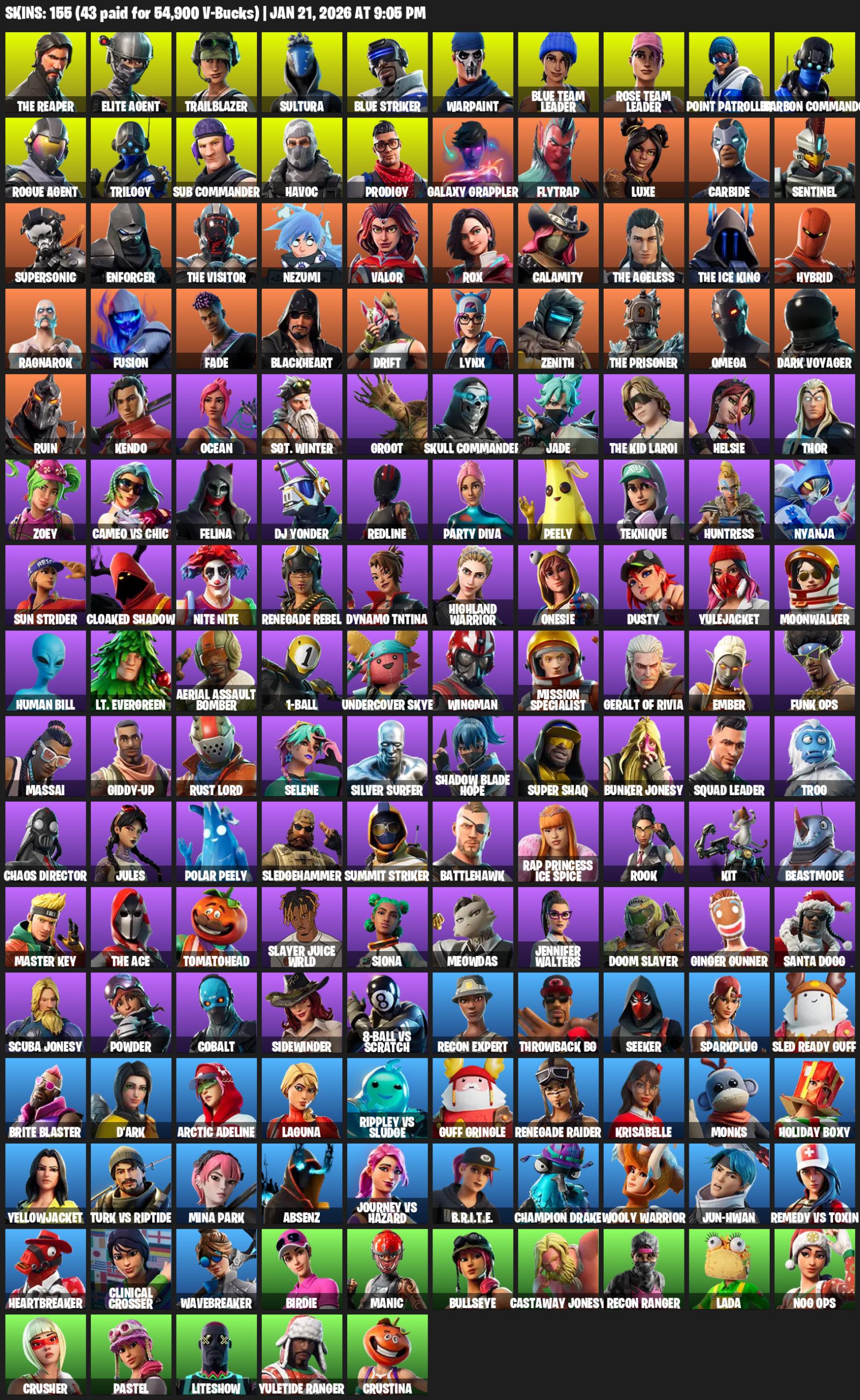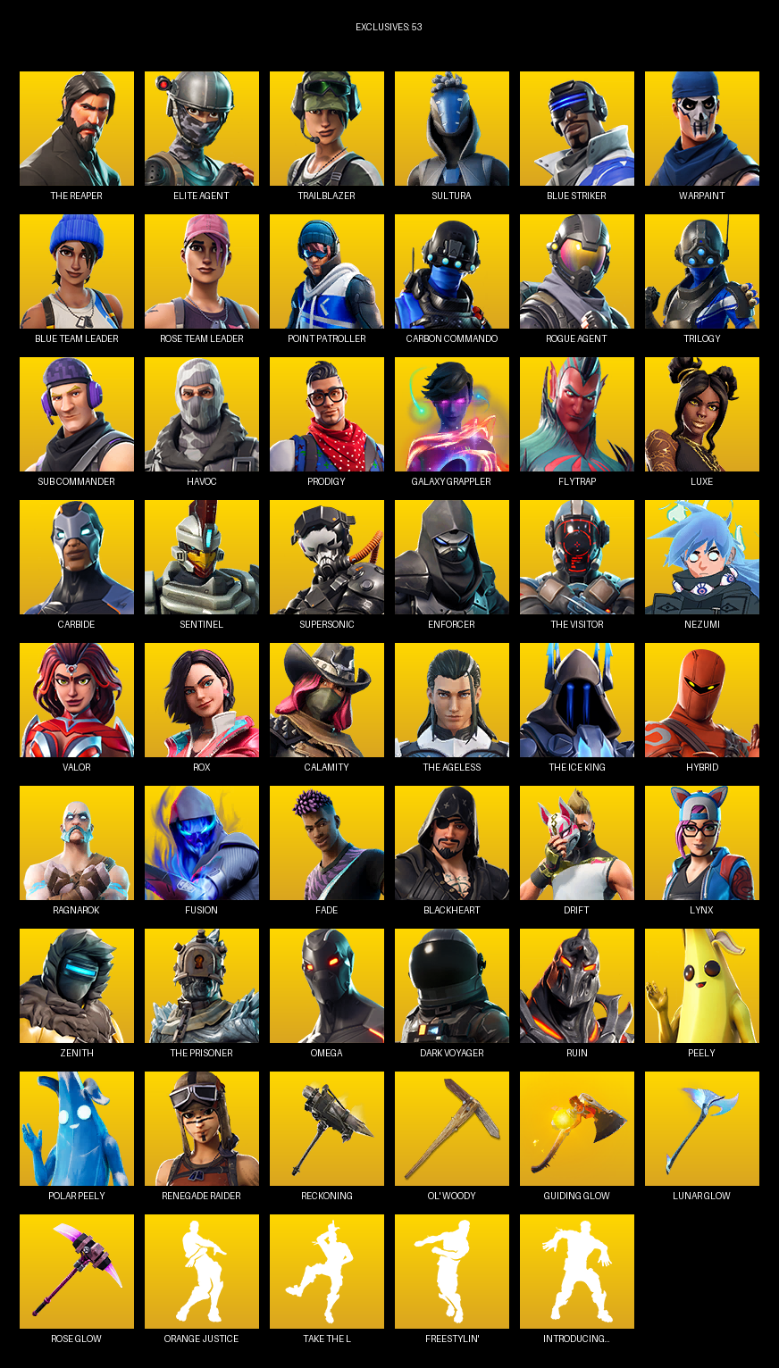 The Reaper, Elite Agent, Point Patroller, Omega, Renegade Raider, Trailblazer, Sultura, Blue Striker, Warpaint, Rose Team Leader, Carbon Commando, Trilogy, Sub Commander, Havoc, Prodigy, Galaxy Grappler, Flytrap, Luxe