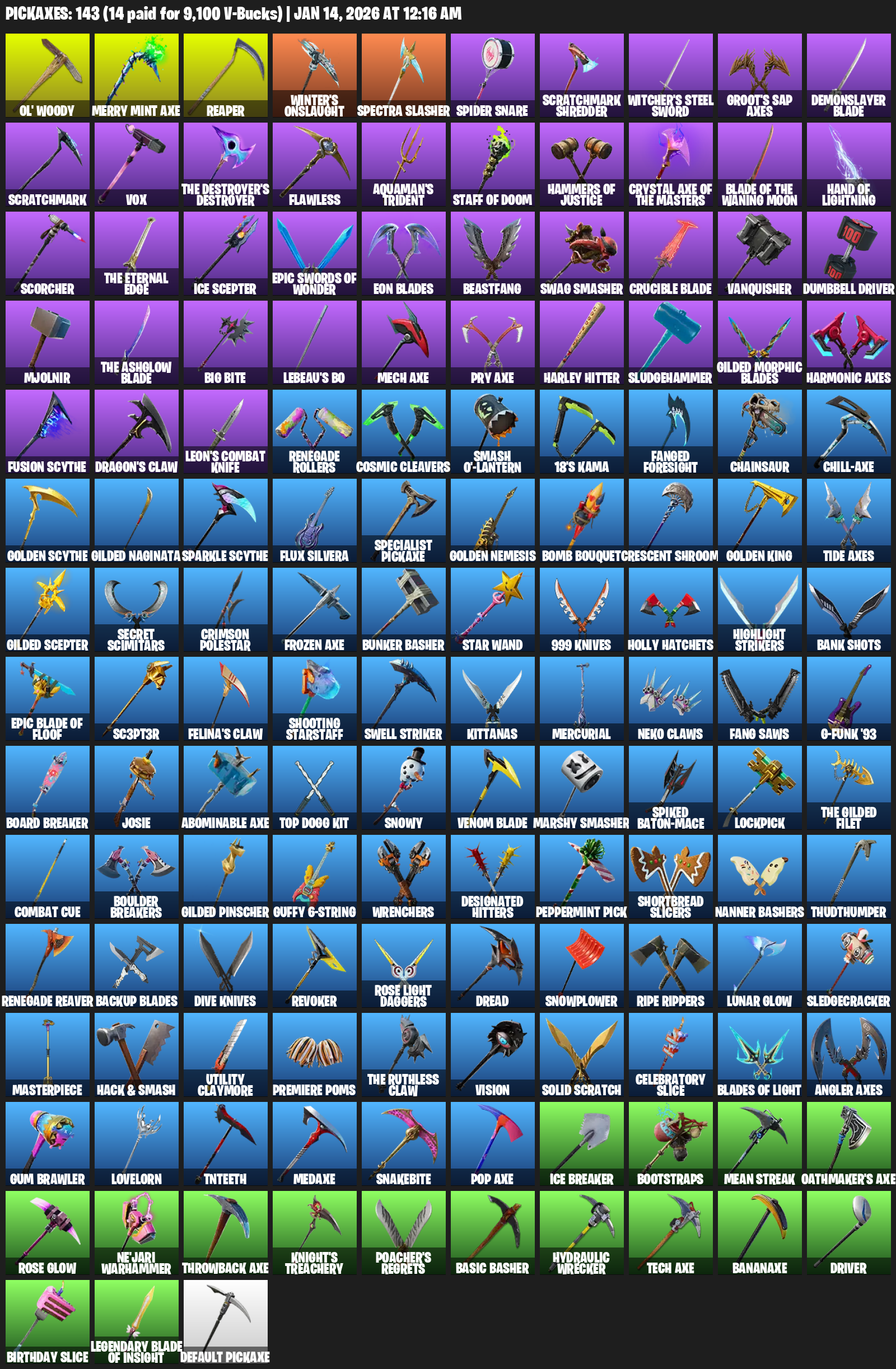 Merry Mint Axe, Ol’ Woody, Reaper, Winter’s Onslaught, Spectra Slasher, Spider Snare, Scratchmark Shredder, Witcher’s Steel Sword, Groot’s Sap Axes, Demonslayer Blade, Vox, Flawless, Aquaman’s Trident, Staff of Doom