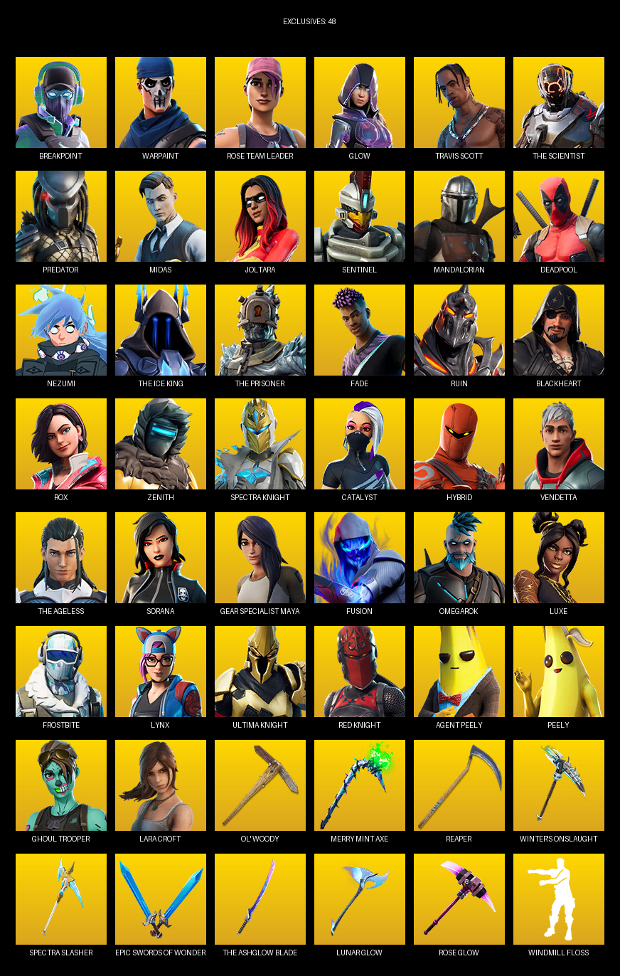 Travis Scott, Gear Specialist Maya, Lara Croft, Breakpoint, Warpaint, Rose Team Leader, Glow, The Scientist, Predator, Midas, Joltara, Sentinel, Mandalorian, Deadpool, Nezumi, Fade, Ruin, Blackheart