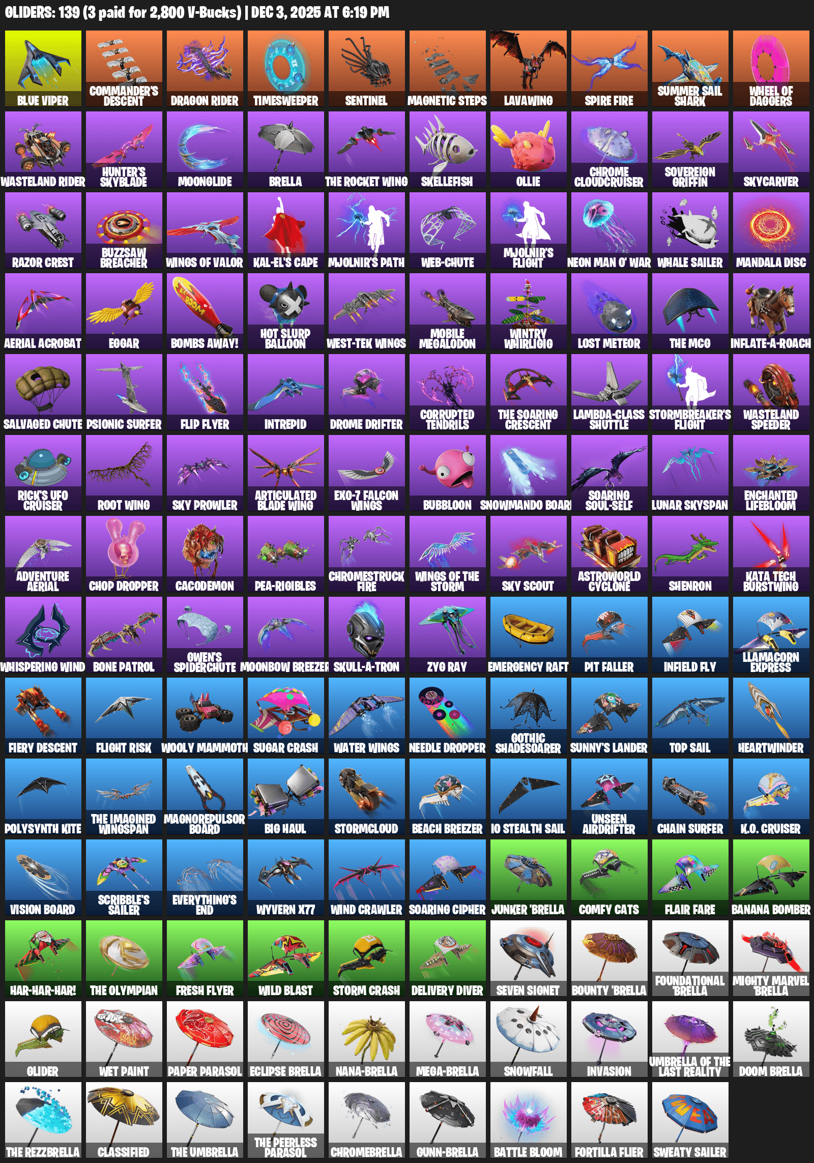 Blue Viper, Commander’s Descent, Dragon Rider, Timesweeper, Sentinel, Magnetic Steps, Lavawing, Summer Sail Shark, Hunter’s Skyblade, Moonglide, Brella, Skellefish, Ollie, Chrome Cloudcruiser, Sovereign Griffin, Skycarver