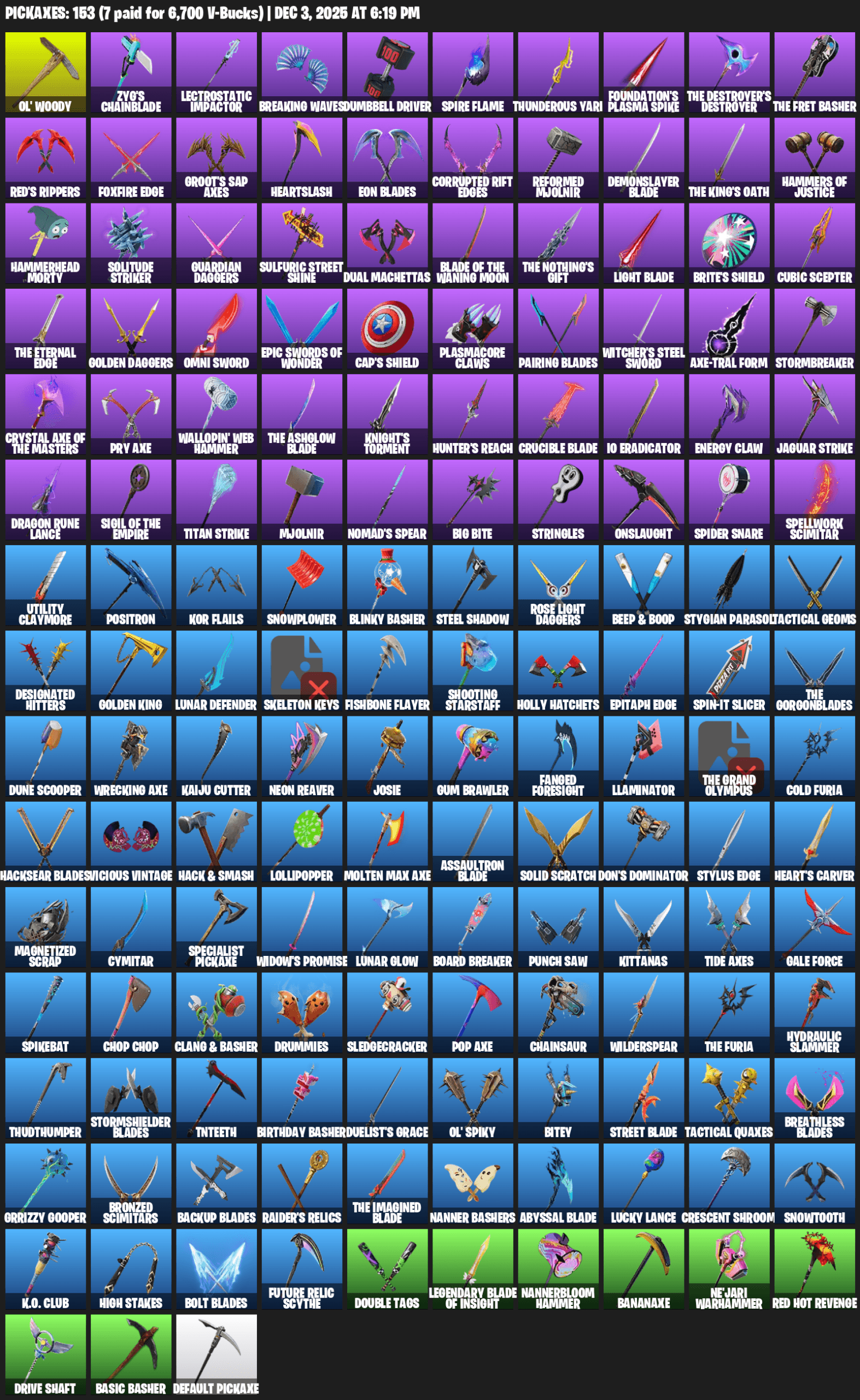 Ol’ Woody, Zyg’s Chainblade, Lectrostatic Impactor, Breaking Waves, Dumbbell Driver, Thunderous Yari, Foundation’s Plasma Spike, Red’s Rippers, Foxfire Edge, Groot’s Sap Axes, Heartslash, Eon Blades, Corrupted Rift Edges, Reformed Mjolnir, Demonslayer Blade, Hammers of Justice