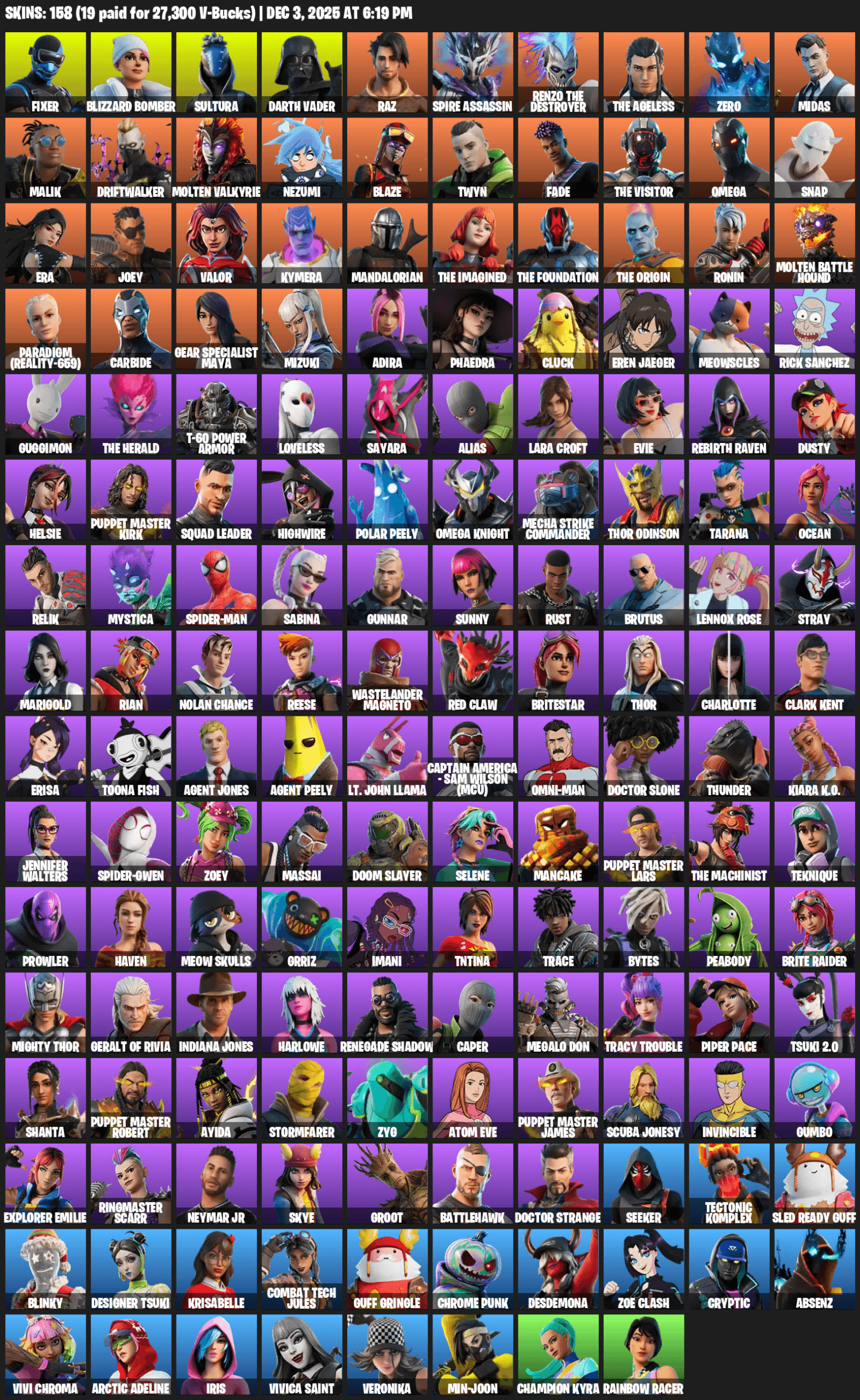 Omega, Gear Specialist Maya, Lara Croft, Fixer, Blizzard Bomber, Sultura, Darth Vader, Raz, Spire Assassin, Renzo the Destroyer, Zero, Midas, Malik, Driftwalker, Molten Valkyrie, Nezumi, Blaze, Twyn, Fade