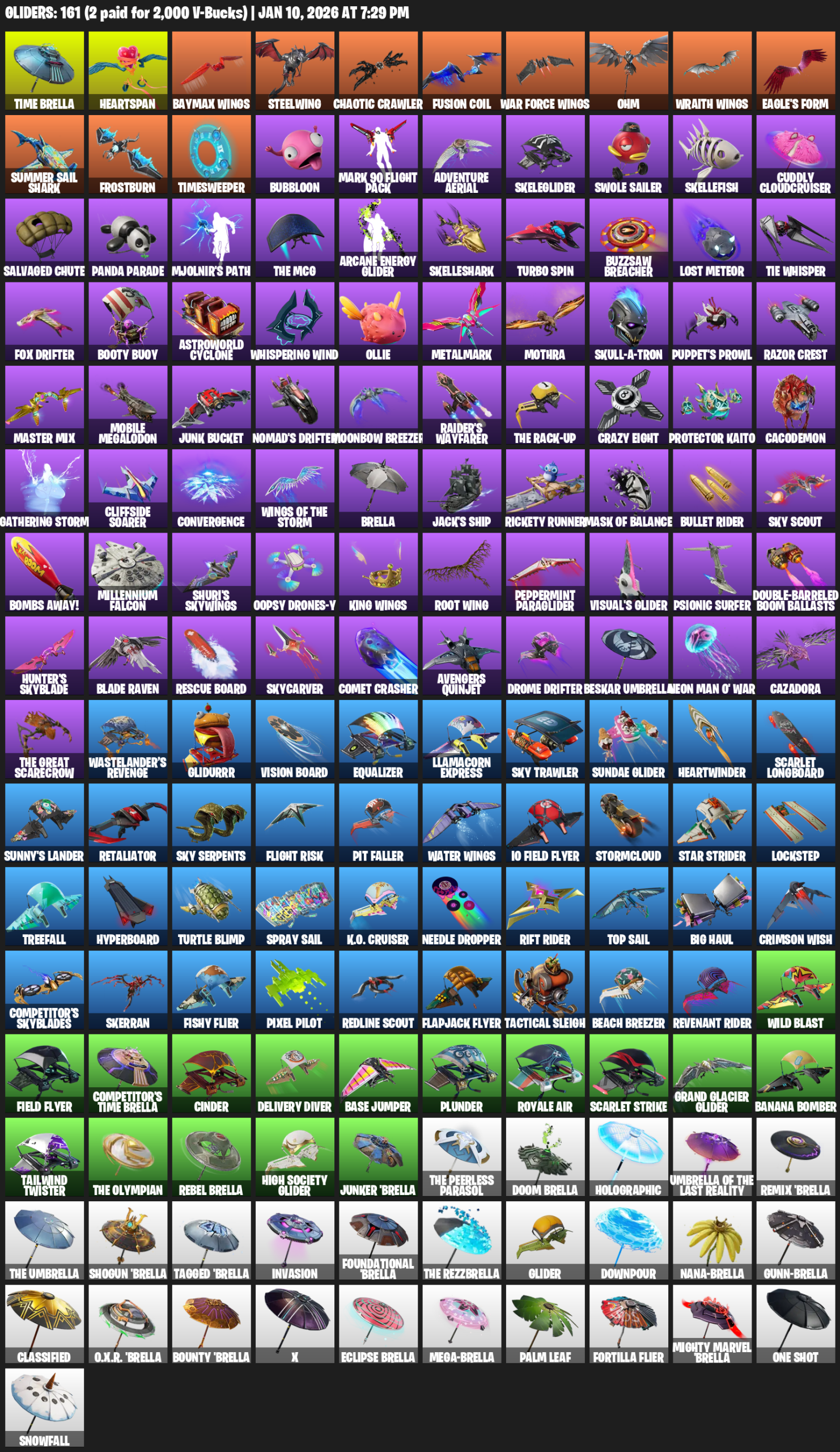 Time Brella, Heartspan, Baymax Wings, Steelwing, Chaotic Crawler, Ohm, Eagle’s Form, Summer Sail Shark, Frostburn, Timesweeper, Bubbloon, Adventure Aerial, Skeleglider, Swole Sailer, Skellefish, Cuddly Cloudcruiser