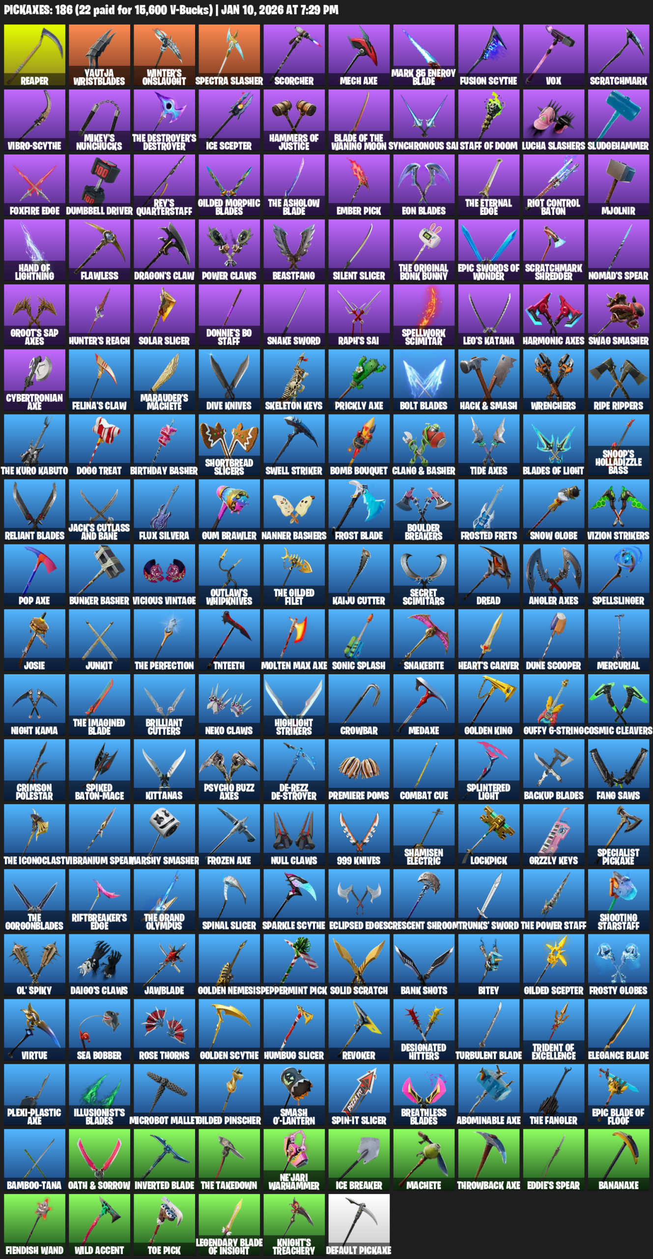 Reaper, Yautja Wristblades, Winter’s Onslaught, Spectra Slasher, Scorcher, Mech Axe, Mark 85 Energy Blade, Vox, Scratchmark, Vibro-scythe, Mikey’s Nunchucks, Ice Scepter, Hammers of Justice, Synchronous Sai, Lucha Slashers, Sludgehammer