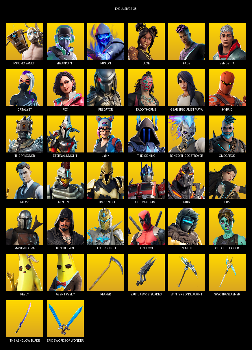 Gear Specialist Maya, Psycho Bandit, Breakpoint, Fusion, Luxe, Fade, Vendetta, Catalyst, Rox, Predator, Kado Thorne, Hybrid, The Prisoner, Eternal Knight, Lynx, Omegarok, Midas, Sentinel