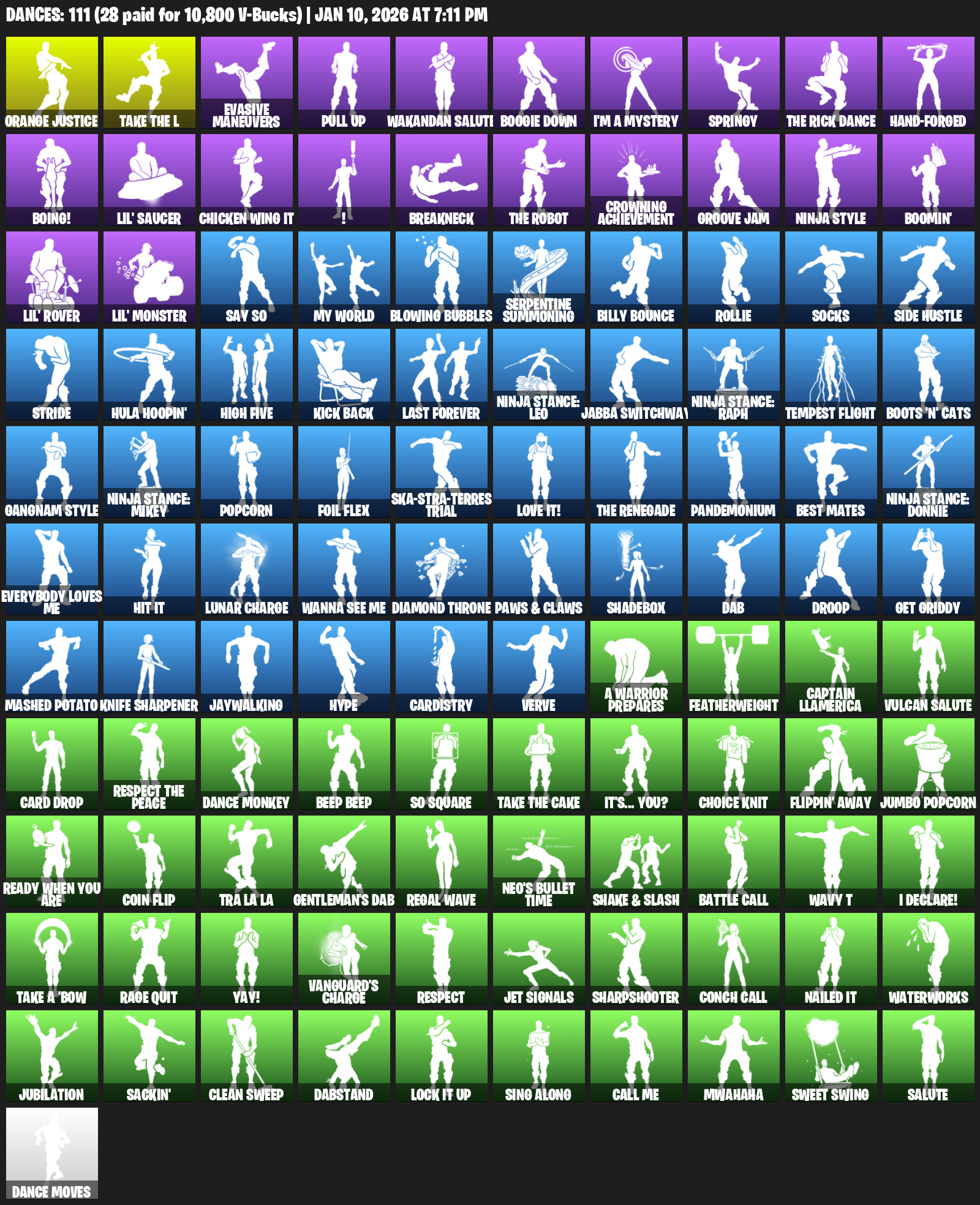 Orange Justice, Evasive Maneuvers, Pull Up, Wakandan Salute, Boogie Down, I’m a Mystery, Springy, Boing!, Lil’ Saucer, Chicken Wing It, !, Breakneck, Crowning Achievement, Groove Jam, Ninja Style, Boomin’