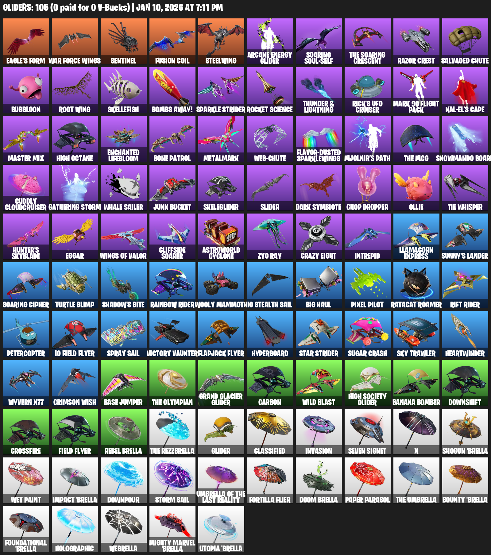 Eagle’s Form, War Force Wings, Sentinel, Steelwing, Arcane Energy Glider, Soaring Soul-Self, Razor Crest, Salvaged Chute, Bubbloon, Skellefish, Bombs Away!, Sparkle Strider, Rocket Science, Rick’s UFO Cruiser, Mark 90 Flight Pack, Kal-El’s Cape