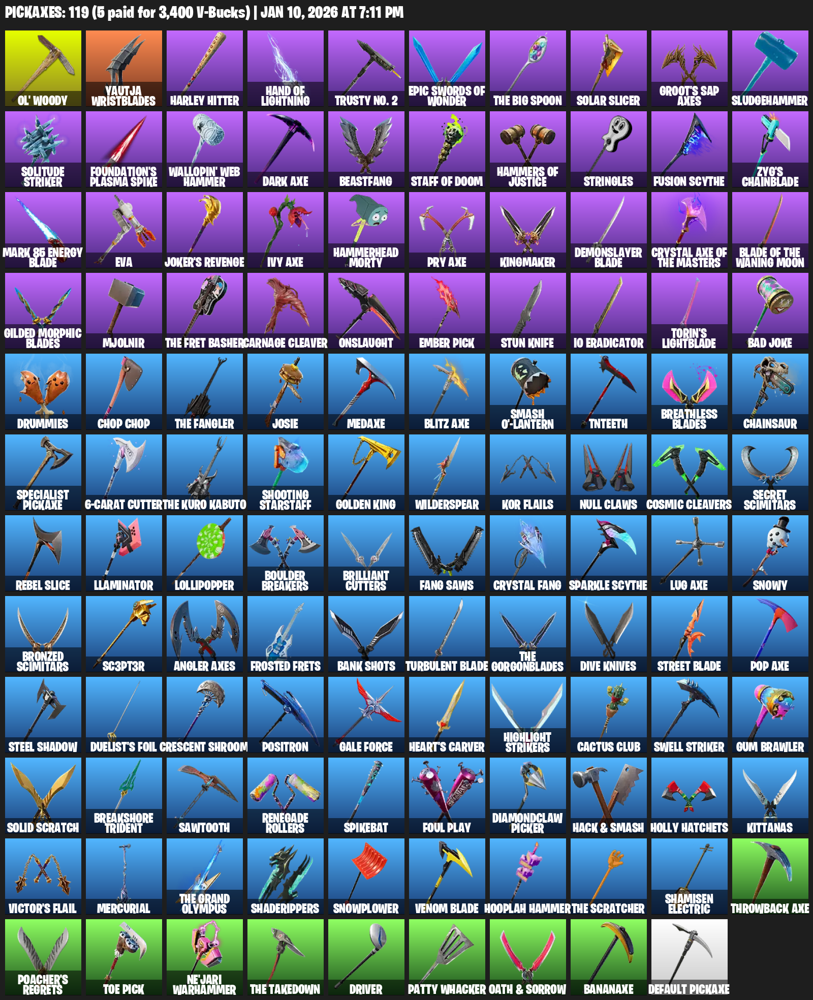 Ol’ Woody, Yautja Wristblades, Harley Hitter, Hand of Lightning, Trusty No. 2, Solar Slicer, Groot’s Sap Axes, Sludgehammer, Solitude Striker, Foundation’s Plasma Spike, Wallopin’ Web Hammer, Beastfang, Stringles, Fusion Scythe, Zyg’s Chainblade
