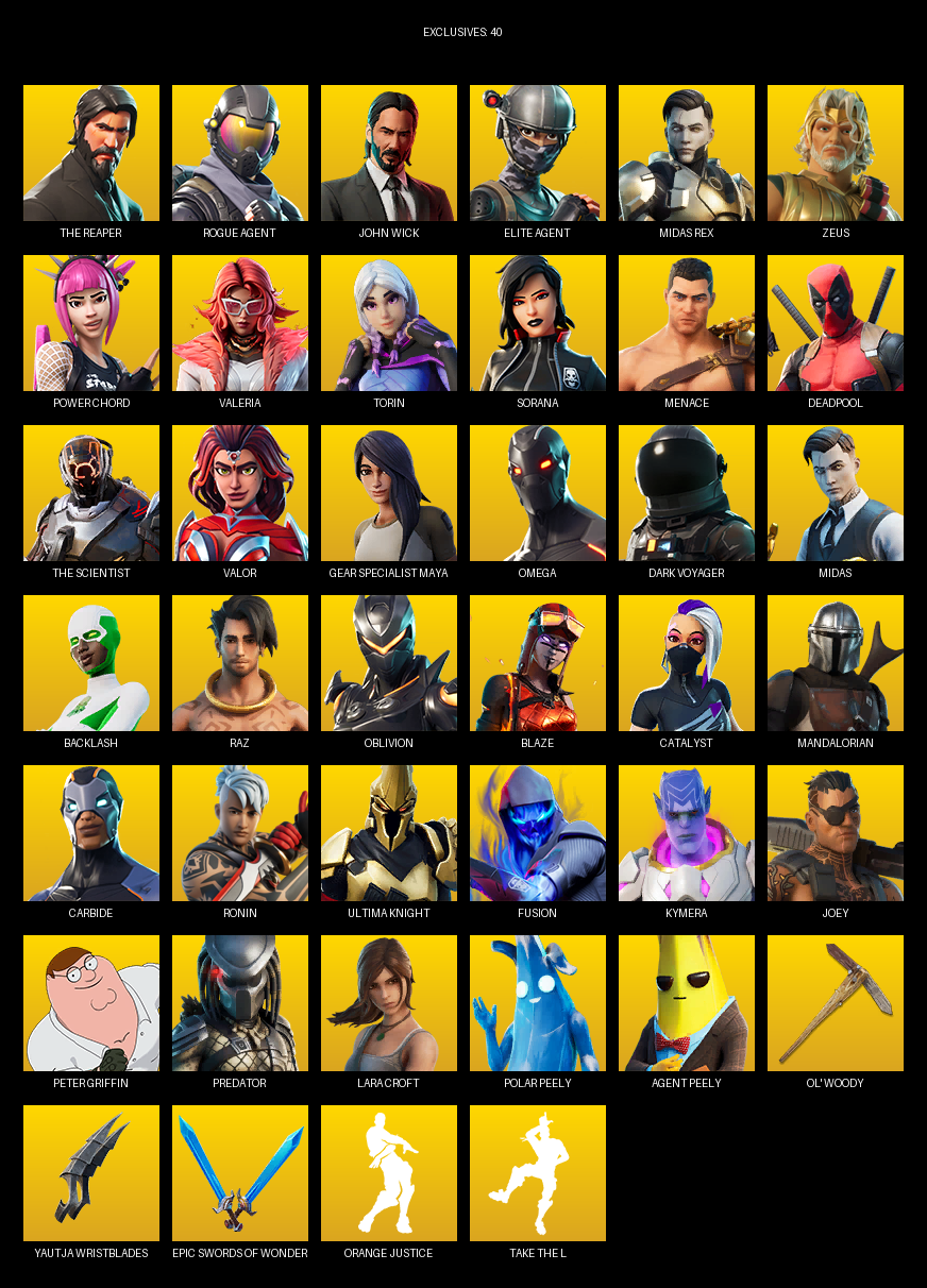 The Reaper, Elite Agent, Gear Specialist Maya, Omega, Lara Croft, John Wick, Midas Rex, Zeus, Power Chord, Valeria, Torin, Sorana, Menace, Deadpool, Valor, Dark Voyager, Backlash