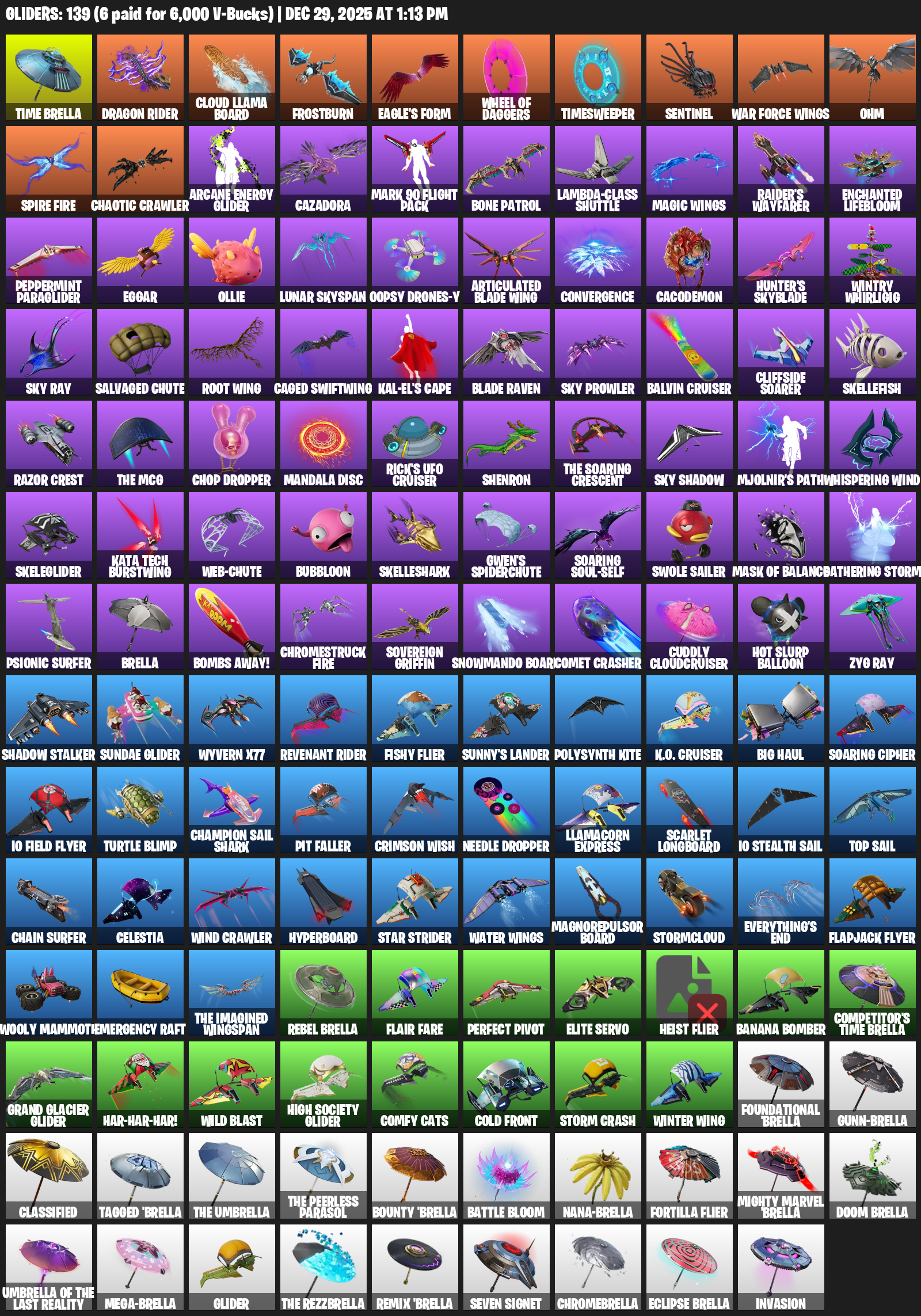 Time Brella, Cloud Llama Board, Frostburn, Eagle’s Form, Wheel of Daggers, Timesweeper, Sentinel, War Force Wings, Ohm, Spire Fire, Chaotic Crawler, Arcane Energy Glider, Cazadora, Mark 90 Flight Pack, Bone Patrol, Lambda-Class Shuttle, Raider’s Wayfarer, Enchanted Lifebloom
