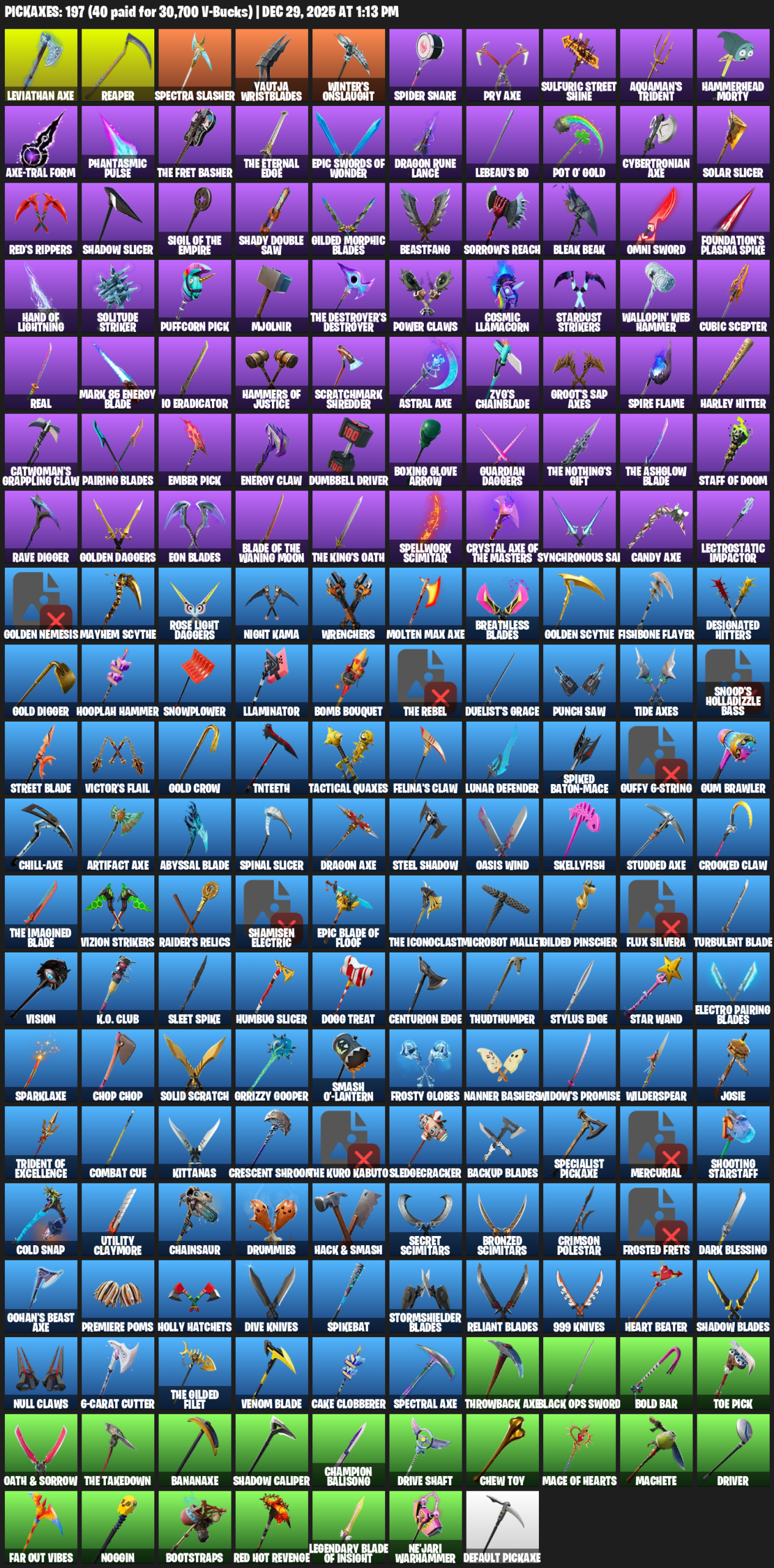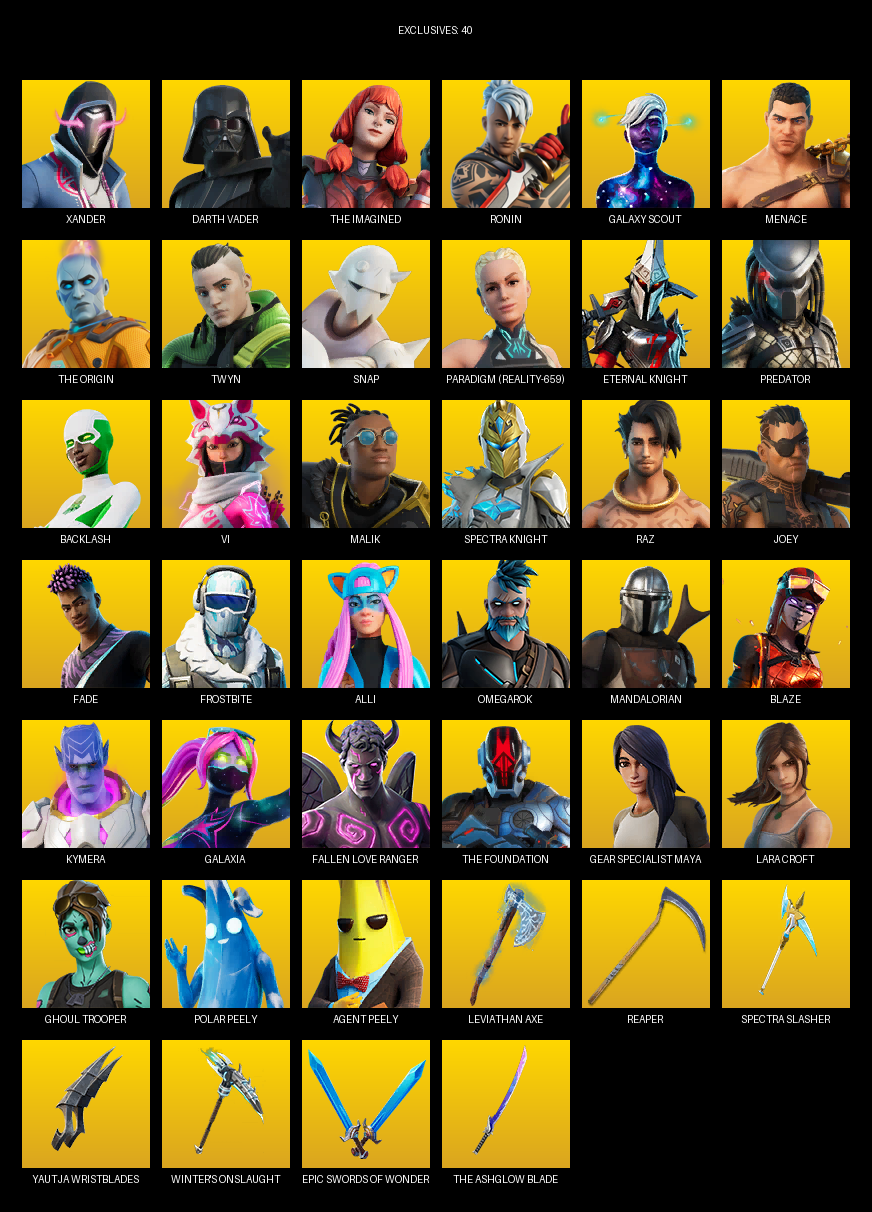 Leviathan Axe, Reaper, Spectra Slasher, Yautja Wristblades, Winter’s Onslaught, Spider Snare, Sulfuric Street Shine, Aquaman’s Trident, Hammerhead Morty, Phantasmic Pulse, Dragon Rune Lance, LeBeau’s Bo, Pot O’ Gold, Solar Slicer