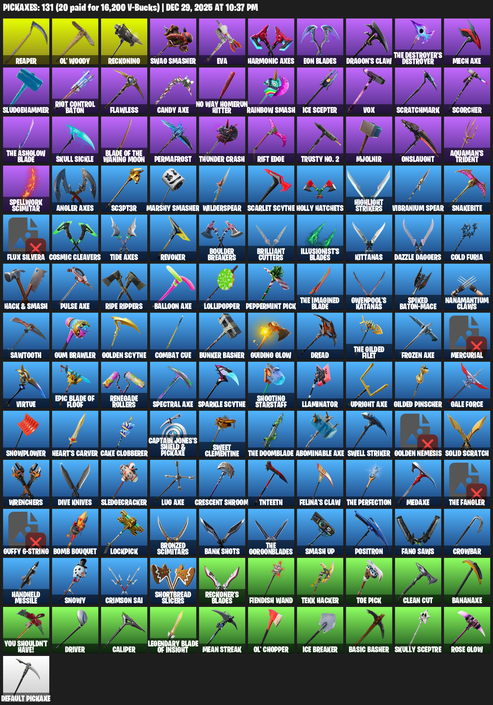 Ol’ Woody, Reckoning, Swag Smasher, EVA, Harmonic Axes, Eon Blades, Dragon’s Claw, Mech Axe, Sludgehammer, Riot Control Baton, Flawless, No Way Homerun Hitter, Rainbow Smash, Ice Scepter, Vox, Scratchmark, Scorcher