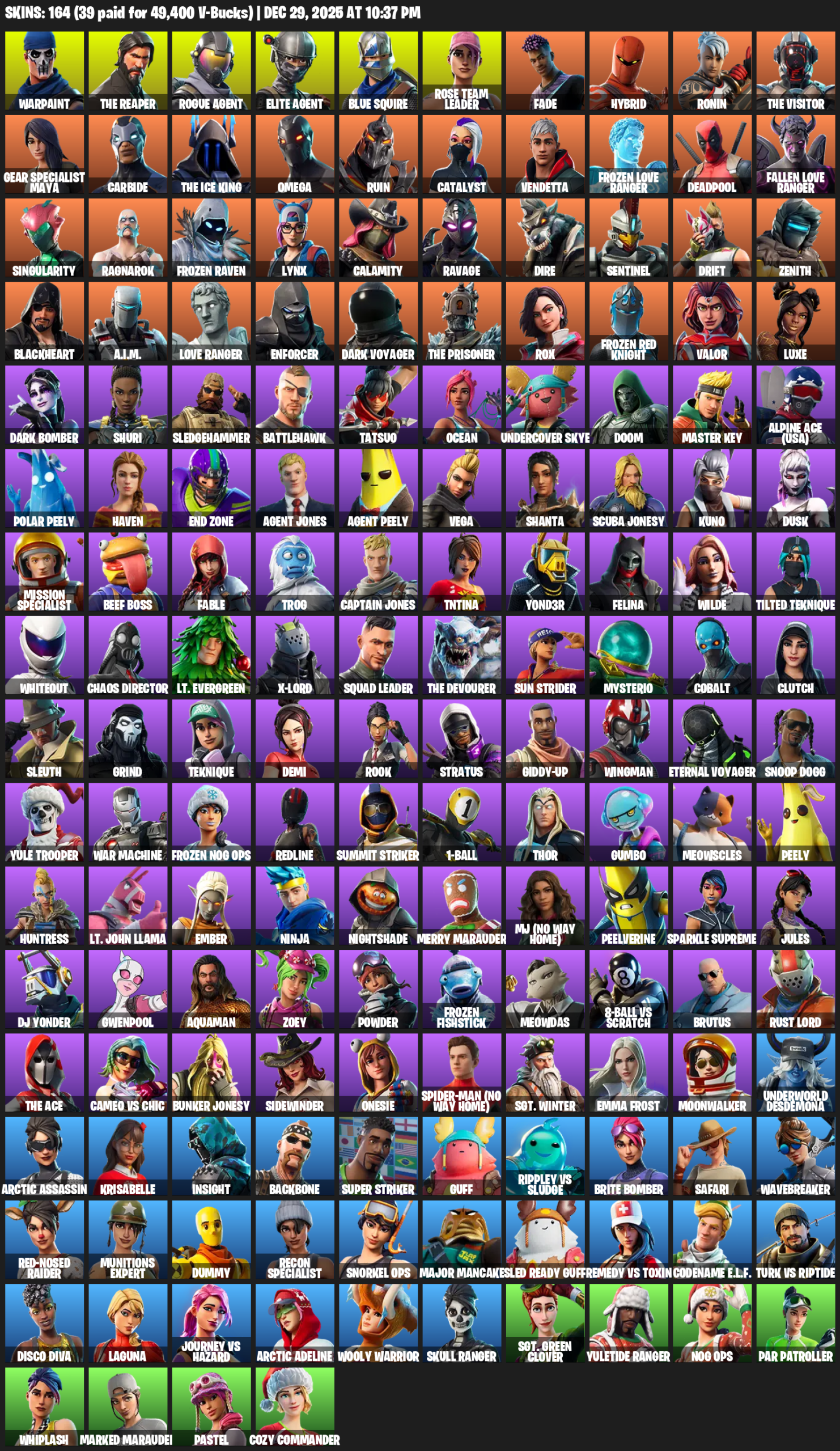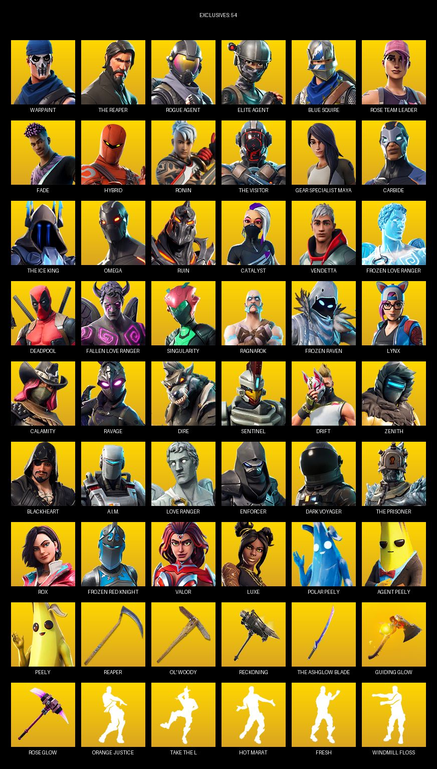 The Reaper, Elite Agent, Blue Squire, Gear Specialist Maya, Omega, Warpaint, Rose Team Leader, Fade, Hybrid, Ronin, Carbide, Ruin, Catalyst, Vendetta, Frozen Love Ranger, Deadpool