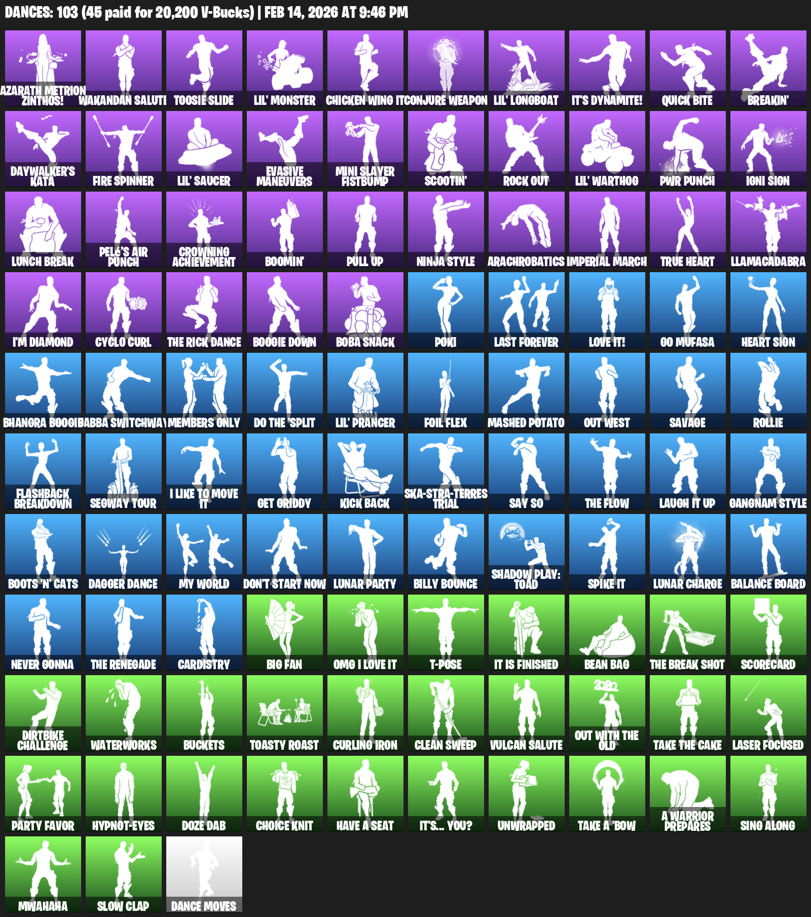 Azarath Metrion Zinthos!, Wakandan Salute, Toosie Slide, Lil’ Monster, Chicken Wing It, Conjure Weapon, It’s Dynamite!, Breakin’, Daywalker’s Kata, Fire Spinner, Evasive Maneuvers, Mini Slayer Fistbump, Scootin’, Rock Out, Igni Sign
