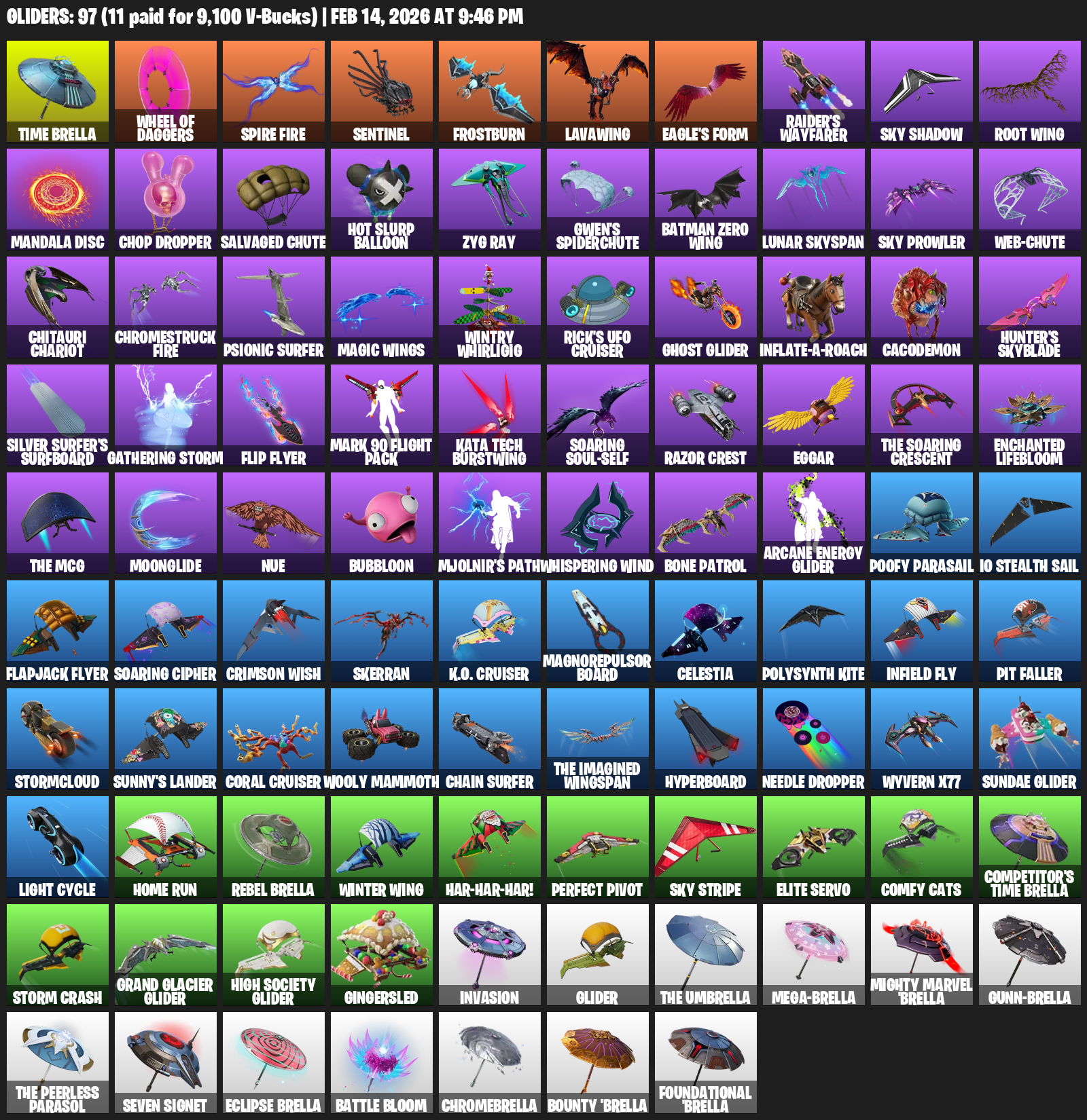 Time Brella, Sentinel, Frostburn, Lavawing, Eagle’s Form, Raider’s Wayfarer, Sky Shadow, Mandala Disc, Chop Dropper, Salvaged Chute, Hot Slurp Balloon, Zyg Ray, Gwen’s Spiderchute, Lunar Skyspan
