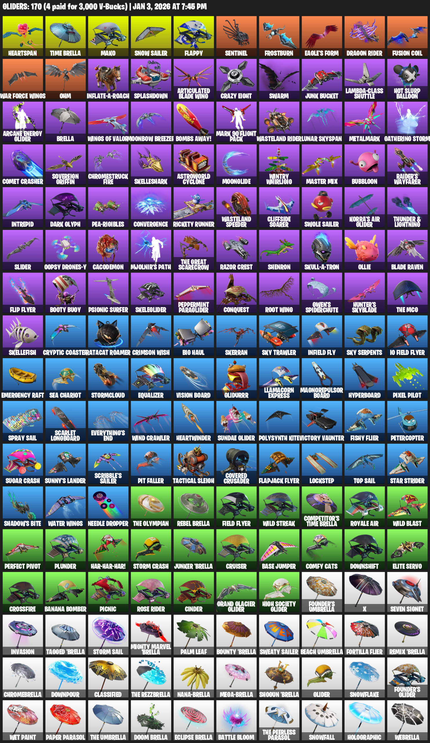 Mako, Heartspan, Time Brella, Snow Sailer, Flappy, Sentinel, Frostburn, Eagle’s Form, Fusion Coil, War Force Wings, Ohm, Inflate-A-Roach, Splashdown, Articulated Blade Wing, Crazy Eight, Swarm, Junk Bucket, Lambda-Class Shuttle