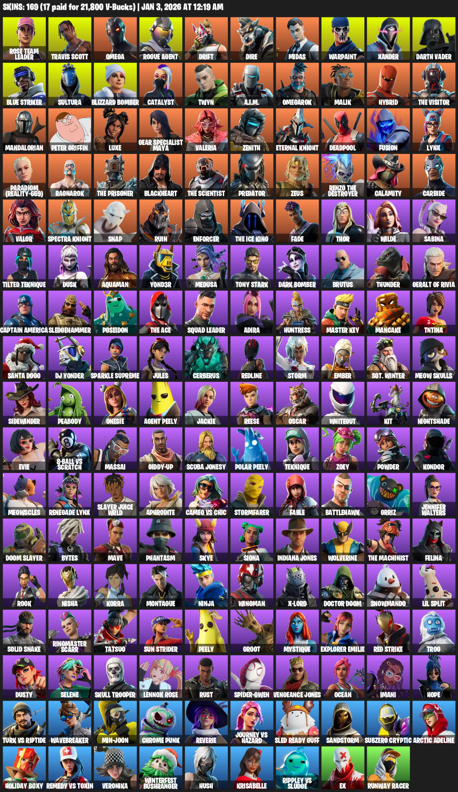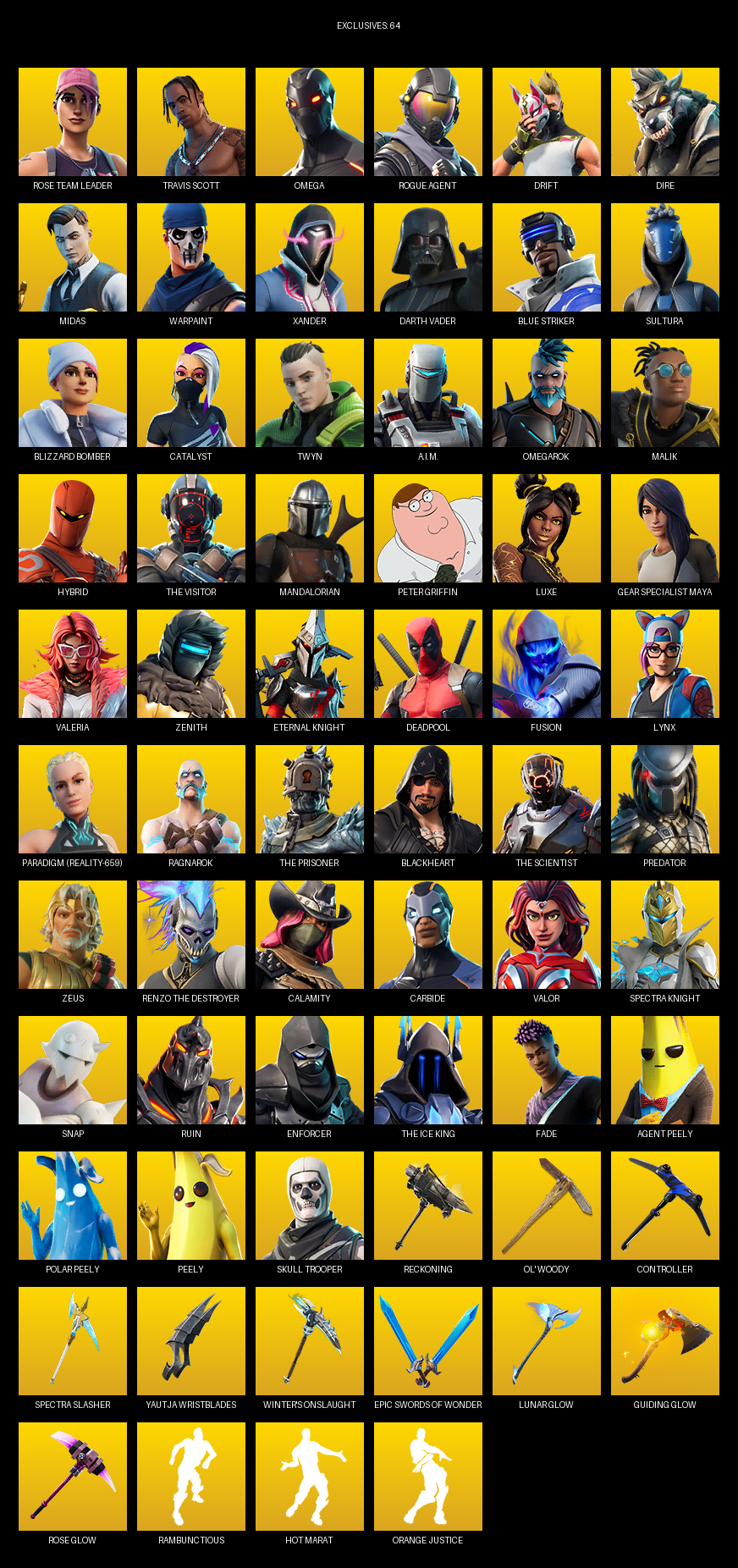 Travis Scott, Omega, Gear Specialist Maya, Rose Team Leader, Rogue Agent, Drift, Dire, Midas, Warpaint, Xander, Darth Vader, Blue Striker, Sultura, Blizzard Bomber, Catalyst, Twyn, A.I.M., Omegarok, Malik, Hybrid