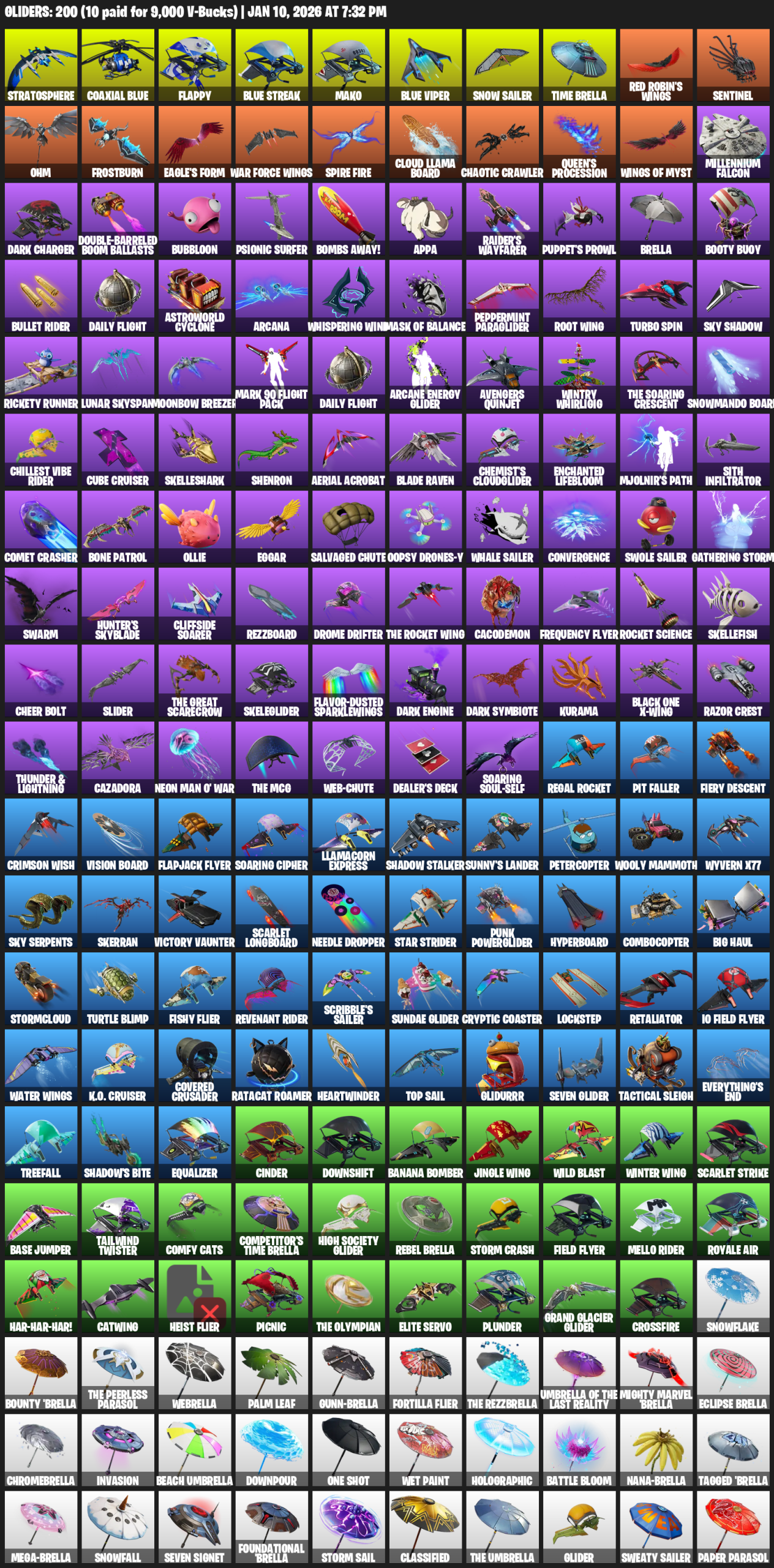 Mako, Stratosphere, Flappy, Snow Sailer, Time Brella, Red Robin’s Wings, Sentinel, Ohm, Frostburn, Eagle’s Form, Spire Fire, Cloud Llama Board, Chaotic Crawler, Queen’s Procession, Millennium Falcon